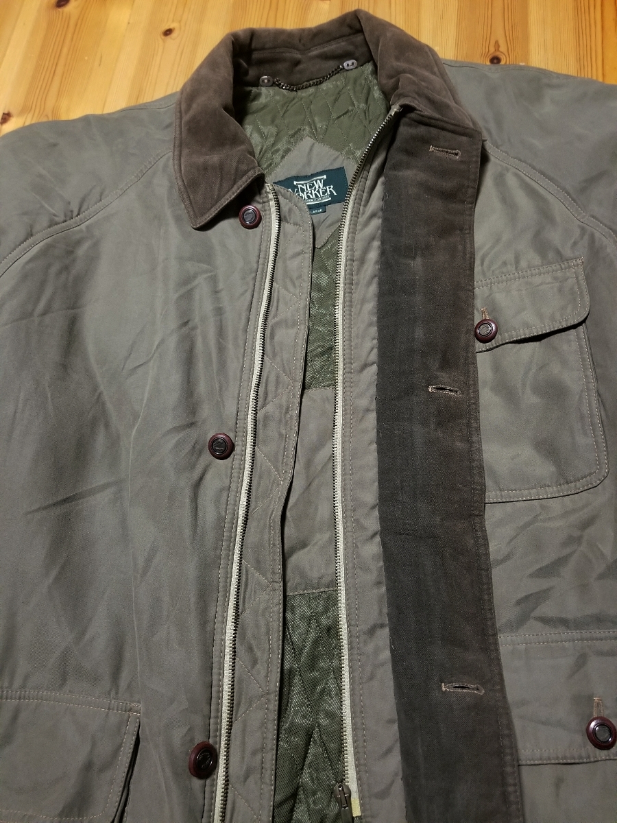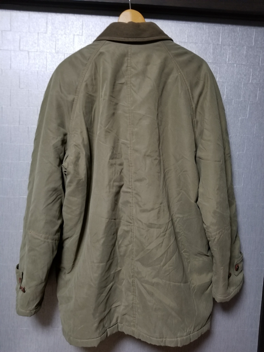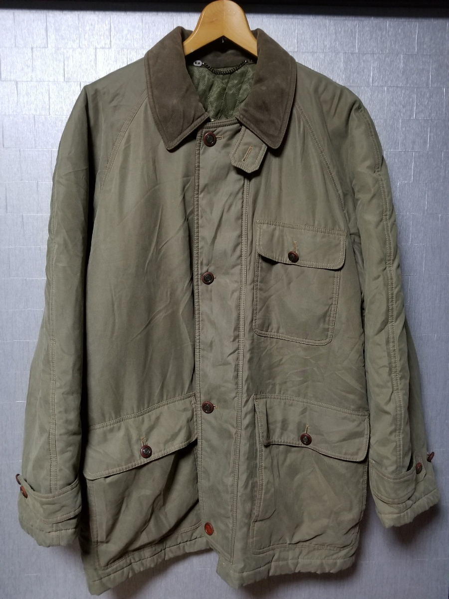 こちらはお馴染みの定番ブランド、ニューヨーカーの限定メンズ中綿ジャケットになります。 希少なイタリア製の品で、素材はポリエステルとナイロンとポリウレタンの混紡生地で、中身は中綿入りのような質感ですので暖かいです。 カラーはグリーンカーキのようなカラーで、サイズはメンズのLの表記で、着丈は襟上から86㎝、身幅61㎝になります。 状態はこれといった目立つ汚れやキズなどはありませんが、一番下の木ボタンの中心のパーツが欠品しております。 また、元々の素材の性質上もあり若干の褪せはあります。 画像でも確認出来るように、襟や比翼部分内側の異素材生地デザイン、柄刻印パーツ入り木ボタン、内側のキルティングライニング、内側のファスナー付きポケット、ブランドマーク布タグ、フラップポケットなど、このモデルならではのクラシックなこだわりが随所に見受けられます。 今回格安からのスタートになりますので、お早めにどうぞ。 お支払いはかんたん決済、又は銀行振込みにてお願いいたします。