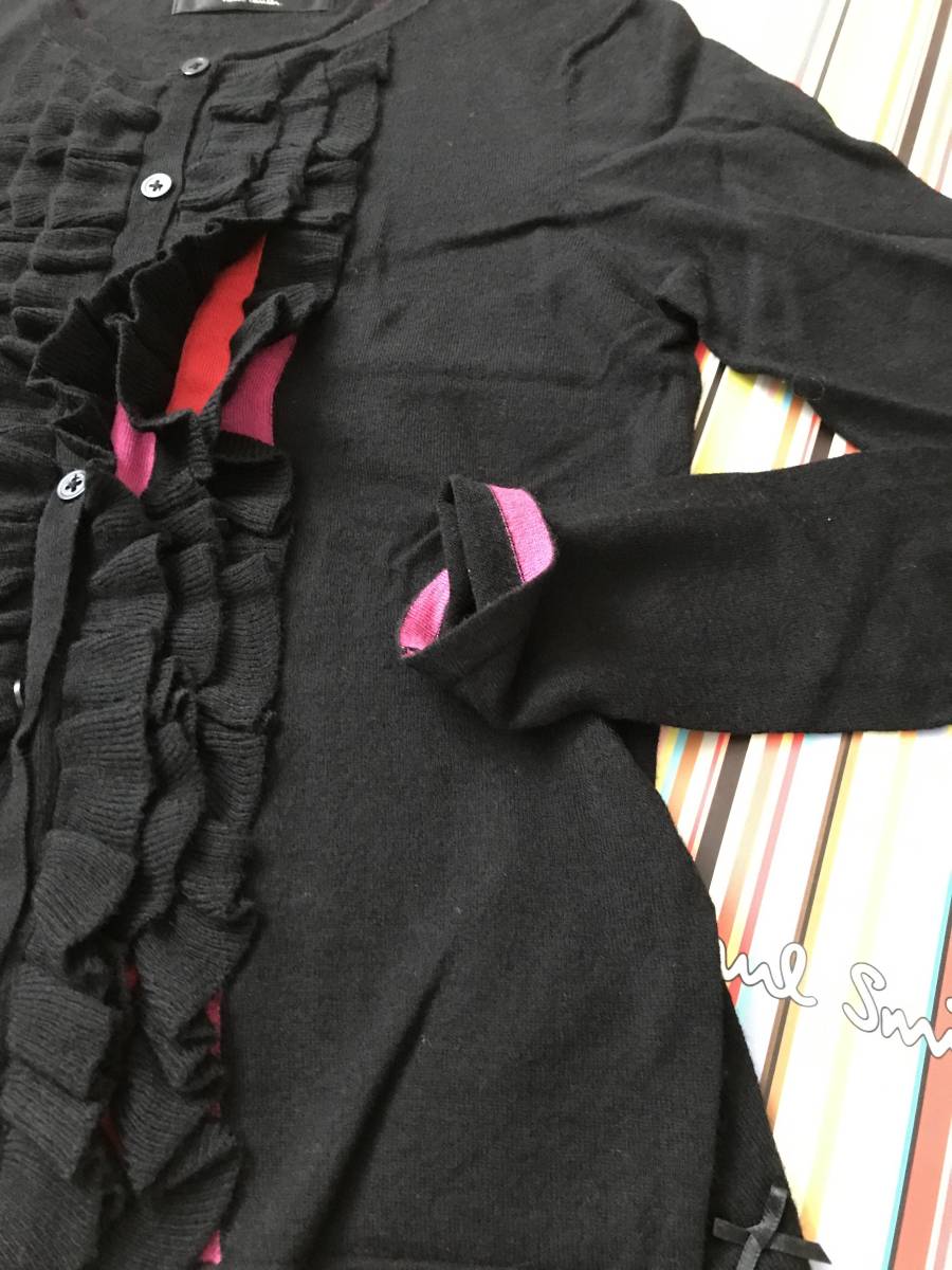 新品 サイズはMです。カラーはブラックに内側フリルはレッドとピンクです。襟内側と裾内側はレッドです。裾内側はピンクです。フリル3段で内側はピンクとレッドです。肩幅37cm胸回り80cm着丈49cm袖丈61cmです。記載は胸回り79-87cm 身長158-164cmです。素材はウール50%レーヨン50%です。着用するとフリルのカラーが見えて揺れて可愛いです。購入価格は35000円程でした。