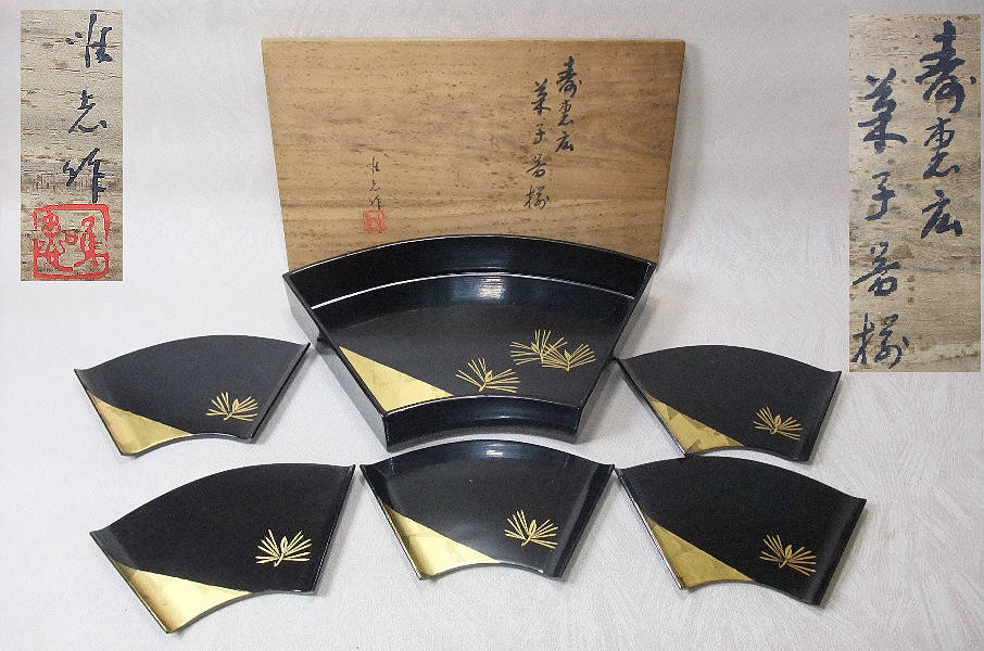 【睦】金蒔絵 寿末広 菓子器揃「准志作」天然木 本漆器 美品 共箱■