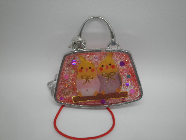 ハンドメイド・レジン ☆2羽のオカメインコ(イラスト)☆ バッグ型・ストラップ