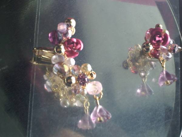 新品・ハンドメイドです。 カラー ローズ ライトピンク ホワイト 透明 ワイン 金具は金色です。 素材 ガラス ガラスパール アルミ ロジウムメッキ サイズ 飾り部分 4cmx1cm 1.5cmx1.2cm しずく 長さ7mm イヤリング金具は調節可能なネジ羽式です。 イヤークリップが合わない方でも使いやすいです。 |