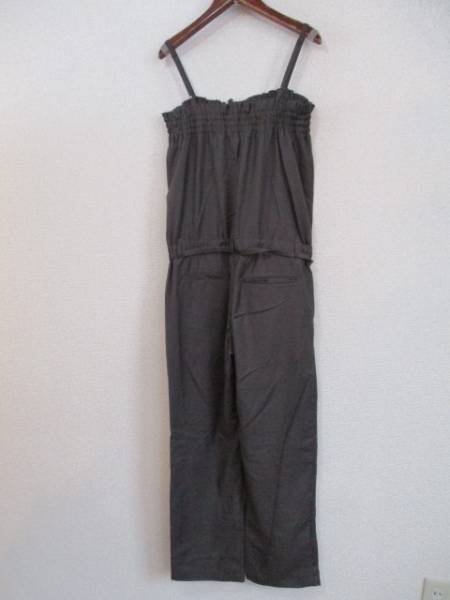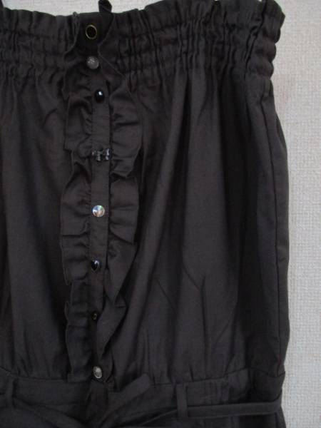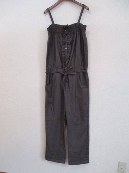| 商品紹介 | こげ茶のキャミソール型オールインワンです。 形の違うボタンとボタン周りのフリルがデザインのポイントになっています。 ウエストは紐が付いていて、結ぶ形です。 パンツ部分はテーパードラインで、オールインワンですが、きれいめに着られます。 《素材》 ポリエステル70% レーヨン30% |