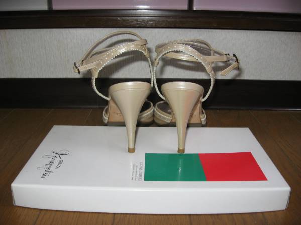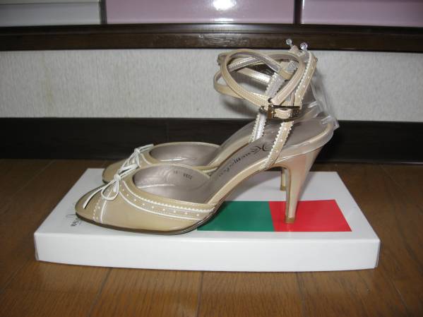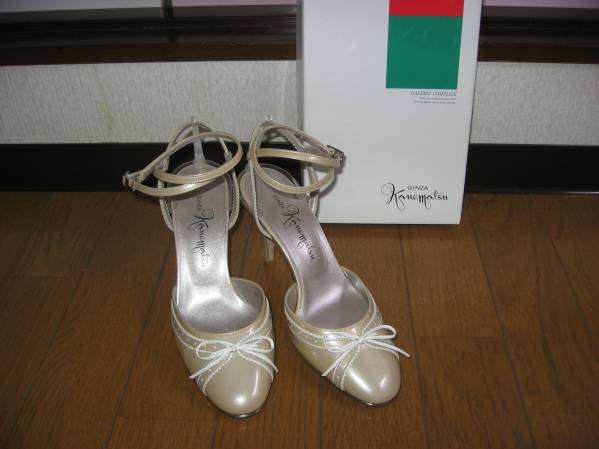 銀座かねまつの甲リボンアンクルストラップパンプス(USED)です。お色はベージュ系、パテント(エナメル)素材です。表記サイズは23.0cm、ワイズ表記はD、ヒールは約8.5cmです。甲の結びリボンが可愛いパンプスです。アンクルストラップ部は引っ掛けて留めるフックタイプですので脱着が楽チンです。商品状態は、2回程度使用しました。全体的に目立ったダメージはなく、とても状態は良いと思います。※ご入札ご希望の方は、当方の自己紹介欄をよくお読みの上、ご入札下さいませ。落札後のキャンセルはご遠慮下さい。ノークレーム、ノーリターンでお願いします。他にも色々と出品中です。よろしければご覧下さい。