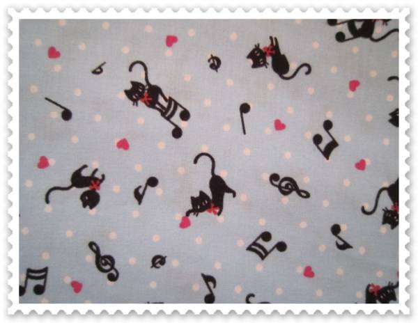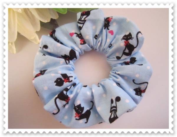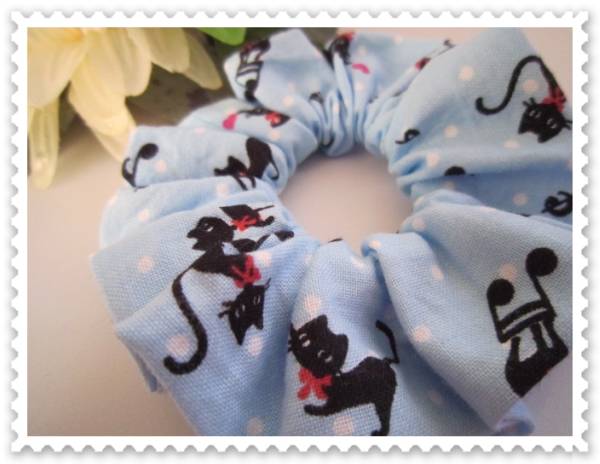 ★シュシュ★黒ネコ&音符&水玉&ハート★ブルー系★