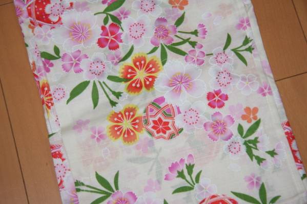 オフホワイト地に桜と撫子のお花と可愛い毬柄をとりいれた女の子らしくってとっても可愛い浴衣です。