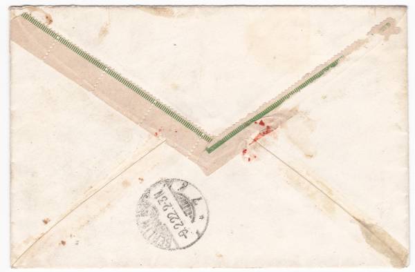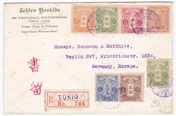 田沢旧大正毛紙5厘、1銭、1銭5厘、2銭2枚、3銭、30銭貼外信書留書状