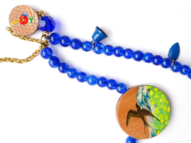 たくさんのブルーのビーズに木型の靴や木のパーツに女の子やお花、ツバメの絵が書かれています。