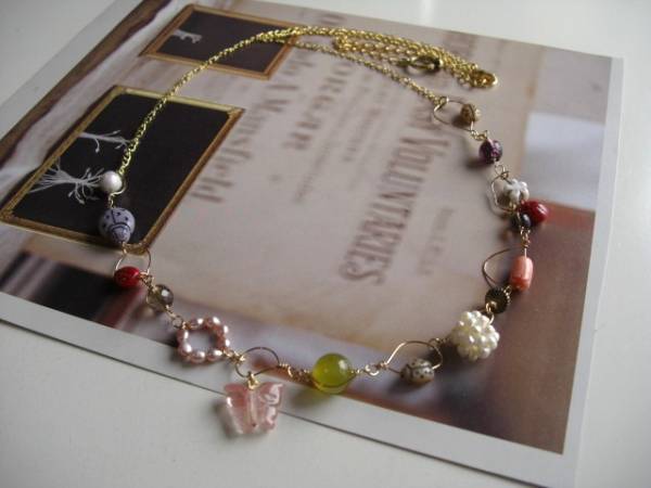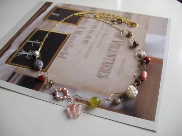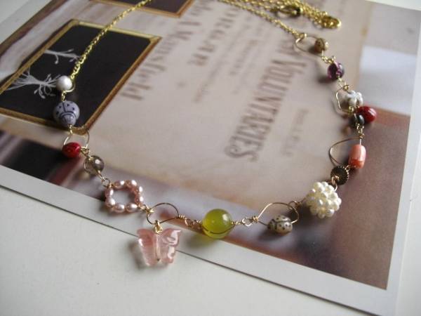 物語をアートして・・シリーズです♪お気に入りのモチーフ・・淡水パールやピンク珊瑚やスモーキークォーツやオリーブジェイドやチェリークォーツ、チェコビーズ、アンティークビーズなどやさしい色を集めたネックレスです♪8ミリから16ミリ位までのランダムカットや丸玉、てんとう虫や蝶やお花などデザイン違いの石をワイヤーで繋いでロマンチックな表情です♪長さは全長80センチ位で調節自由です♪2連にされてもブレスにされても素敵です♪お揃いのネックレスやブレスレットやイヤリングも出品しています♪ハンドメイドをご理解頂いてノークレーム、ノーリターンでお願いします