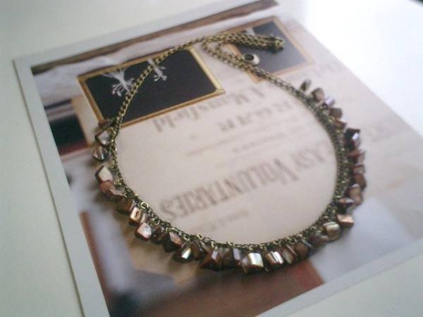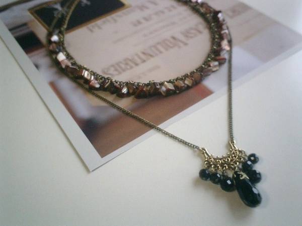イーニド・ファッション・・シリーズです♪シックな秋色・・オニキスとブラウンシェルのネックレス2本セットです♪深い黒のオニキスとブラウン・ベージュのシェルがアンティーク・モダンな表情です♪7ミリ位のブラウンシェルはランダムに繋いで可憐な表情です♪長さは全長65センチ位で調節自由です♪チョーカー風にされても素敵です♪クラシカルなデザインチャームに合わせたオニキスは22×10ミリ位のドロップカット、10×8ミリのドロップカット、6ミリのランダムカットです♪長さは68センチ+アジャスター14センチで最長82センチ位です♪それぞれ単品やブレスレットも出品しています♪シンプルで飽きのこないいつまでも着けられるデザインを考えて作りました!ハンドメイドをご理解頂いてノークレーム、ノーリターンでお願いします
