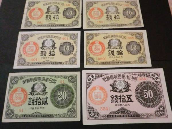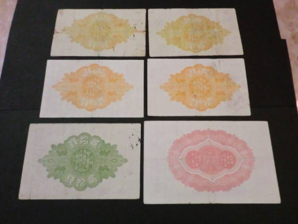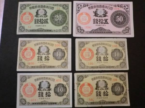 大正小額紙幣10銭(7年・8年・9年・10年)・20銭(8年)・50銭(9年)の6枚セットです。
