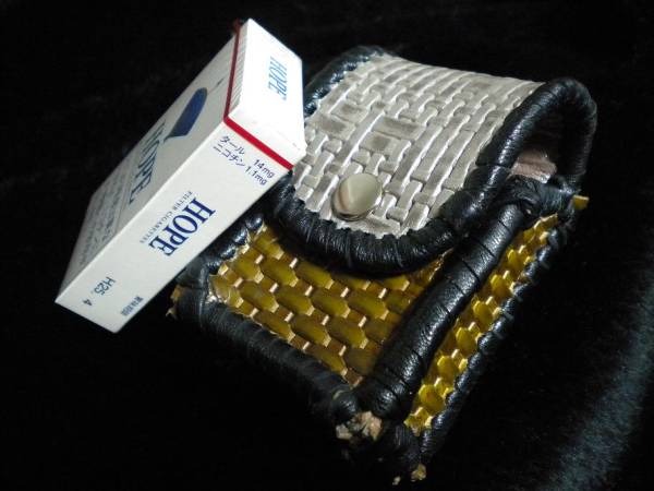 表面の正面側、両側面、底の部分は、編み込みデザインを型押した、渋茶カラーのレザーを使用しています。