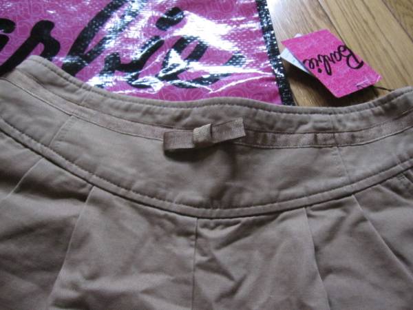 新品 サイズはMです。カラーはベージュ(ライトブラウン) 素材はコットン94%レーヨン5%ポリエステル1%(良質です)です。 ウエスト68cm全長32cmサイドポケット付き 片側ファスナーです。 ウエスト回りにリボンテープのアクセントがあります。台形スカートのような感じでかわいく上品です。購入価格は9000円ほどでした