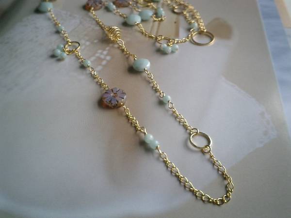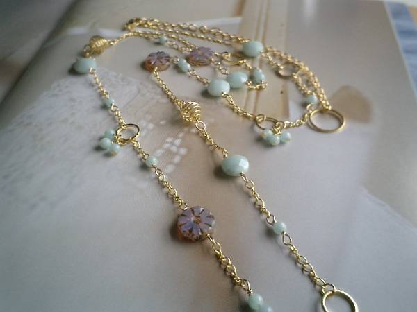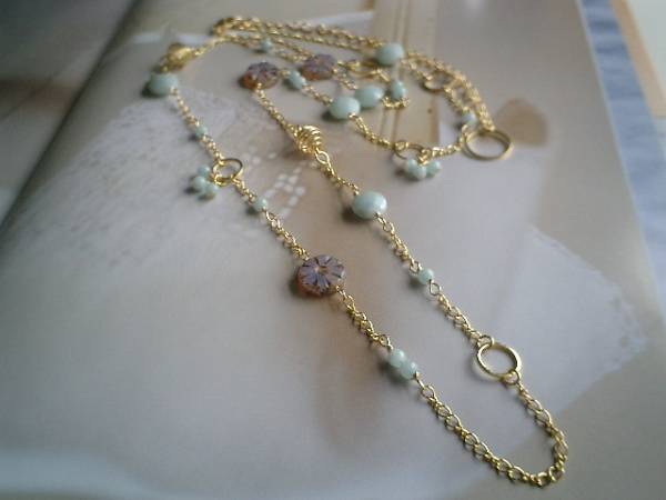 ビター・スィート・・シリーズです♪水色のワンピース・・可憐なアマゾナイトのネックレスです♪10ミリのコインカット、3ミリ、4ミリの丸玉のアマゾナイトに透かし模様のチェコビーズやワイヤーボールやデザインリングを合わせてアンティークモダンしています♪長さは全長100センチ位で調節自由です♪お揃いのネックレスやブレスレットやピアスも出品しています♪シンプルで長く着けていただけるデザインを考えて作りました♪ハンドメイドをご理解頂いてノークレーム、ノーリターンでお願いします