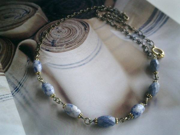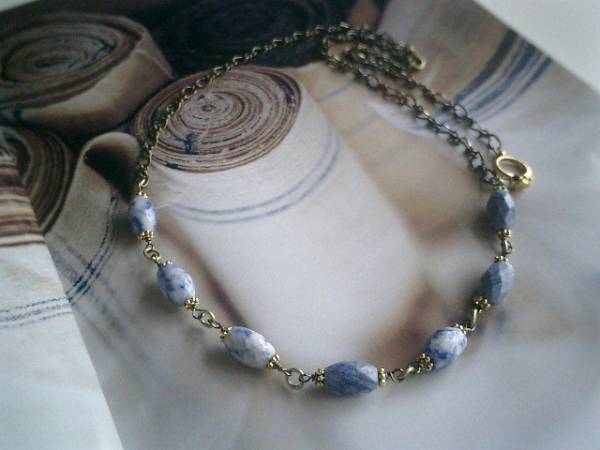私的アート・・シリーズです♪藍色・デッサン・・シックなデニムラピスのネックレスです♪♪藍色やグレー、群青色など様々な色の合わさったデニムラピスは個性的なナツメカットです♪シックな座金でおめかししてアンティーク・モダンしています♪ナツメカットのラピスは12×8ミリ位です♪長さは全長65センチ位で調節自由です♪お揃いのネックレスやブレスレットも出品しています♪シンプルで飽きのこないいつまでも着けられるデザインを考えて作りました!ハンドメイドをご理解頂いてノークレーム、ノーリターンでお願いします