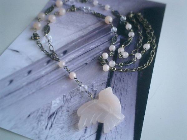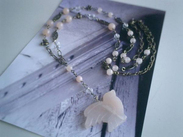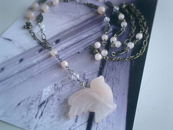 秋の小鳥さん・・シリーズです♪やさしいピンク・・ロマンチックなピーチクォーツのネックレスです♪6ミリ、8ミリの丸玉のピーチクォーツにランダムカットの水晶やデザインチェーンや小鳥さんのチャームを合わせて大人可愛い表情です♪トップのピーチクォーツの小鳥さんは40×32ミリ位です♪長さは全長88センチ位で調節自由です♪♪トップは8センチ位です♪お揃いのブレスレットやイヤリングも出品しています♪シンプルで飽きのこないいつまでも着けられるデザインを考えて作りました!ハンドメイドをご理解頂いてノークレーム、ノーリターンでお願いします