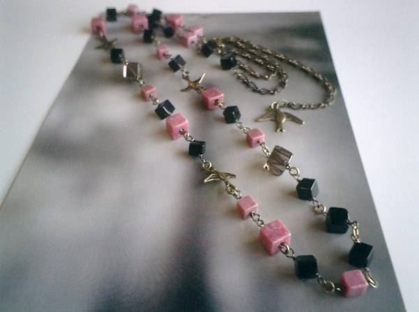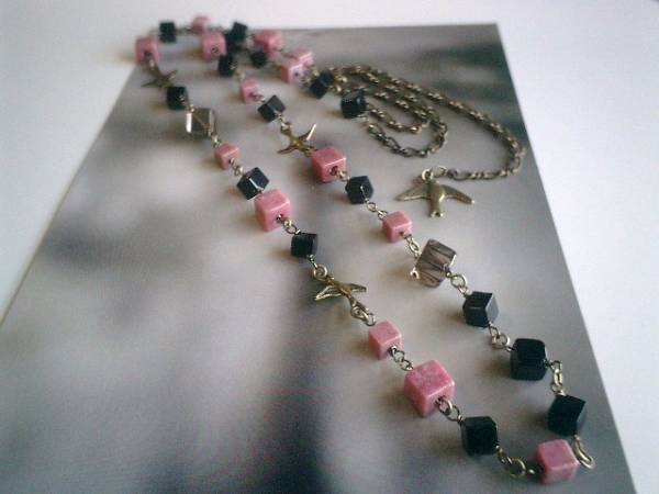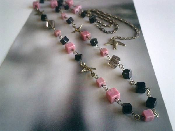 秋の小鳥さん・・シリーズです♪シックなオニキスとロードナイトのネックレスです♪6ミリ、8ミリの大きさ違いのスクエアカットのオニキスやスモーキークォーツやロードナイトに小鳥さんのチャームを合わせてさりげなくロマンチックしています♪長さは全長96センチ位で調節自由です♪2連にされても素敵です♪シンプルで飽きのこないいつまでも着けられるデザインを考えて作りました!お揃いのブレスレット、ピアスも出品しています♪ハンドメイドをご理解頂いてノークレーム、ノーリターンでお願いします