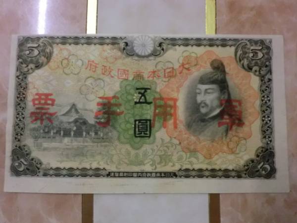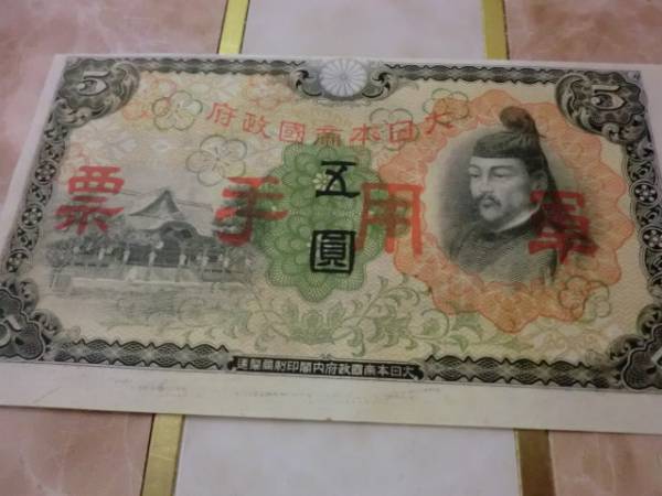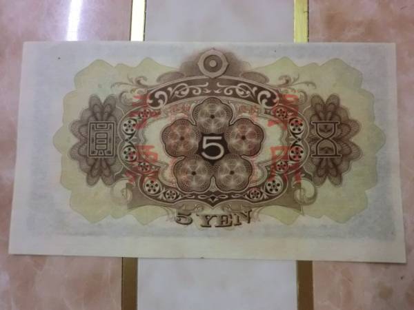 日華事変軍票 丙号5円の準未使用で裁断のズレが有ります。