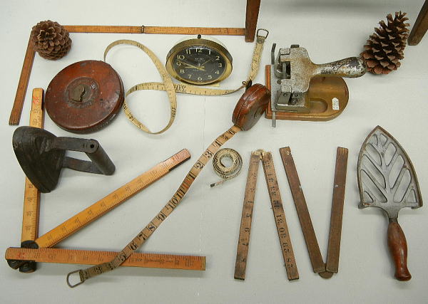 イギリスの蚤の市で見つけてきた巻尺、物差し等11点の セットです。 服屋さん、お花屋さん、雑貨屋さんやカフェの ディスプレイのアイテムにいかがですか。 後で気付きましたが、ほぼ木と皮と金属で出来ている 製品ばかりの集まりです。 大きな損傷はありませんが擦り傷などはあります。 あくまでも、長い年月を経た古い物ということでご理解下さい。 ※折りたたみの物差しの1本に割れた木を 接着補修しているものがありますが、しっかりとひっつています。 寸法 幅 高さ 奥行き 年代 1930~1950年代 アンティークの為お客様との見解の相違が多少あるかと思いますが ご理解の上、ご入札よろしくお願い致します。 | |||||