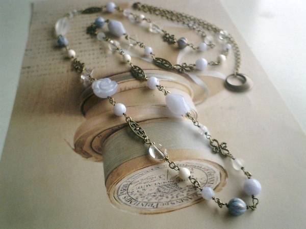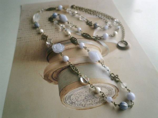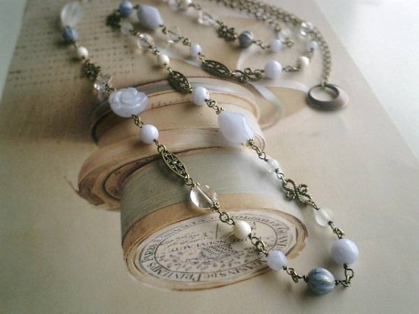 シックな薔薇・・シリーズです♪人魚姫の薔薇・・繊細なブルーレースのネックレスです♪ブルーカルセドニーの薔薇や水晶、フロスト水晶やボーンやチェコビーズ、デザインメタルを合わせてオリエンタル・モダンしています♪ブルーレースは6ミリ、8ミリの丸玉、20×10ミリのツイストナツメです♪水晶、フロスト水晶は6ミリ、8ミリのランダムカットや丸玉、マーキス、スクエア、ラフカットです♪ブルーカルセドニーの薔薇は18ミリ位です♪長さは全長110センチ位で調節自由です♪2連にされても素敵です♪お揃いのブレスレットやイヤリングも出品しています♪シンプルで飽きのこないいつまでも着けられるデザインを考えて作りました♪ハンドメイドをご理解頂いてノークレーム、ノーリターンでお願いします