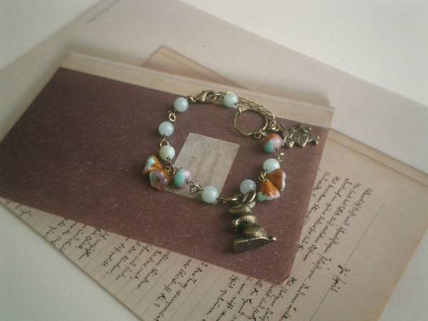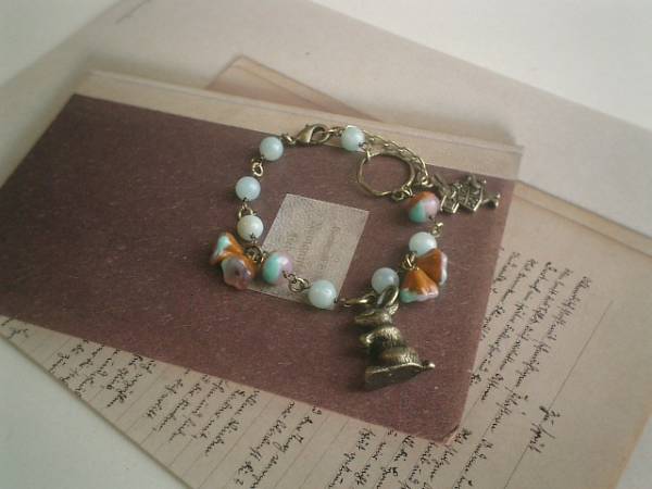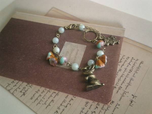 セシル・スタイル・・シリーズです♪シックなアマゾナイト・・アマゾナイトとうさぎさんのキュートなブレスレットです♪ブルーグレーのアマゾナイトは6ミリの丸玉です♪チェコのお花やうさぎさんのメタルチャームを合わせてロマンチックな表情です♪うさぎさんは20×15ミリ位の立体うさぎさんです♪長さは全長23センチ位で調節自由です♪お揃いのネックレスも出品しています♪シンプルで飽きのこないいつまでも着けられるデザインを考えて作りました♪ハンドメイドをご理解頂いてノークレーム、ノーリターンでお願いします