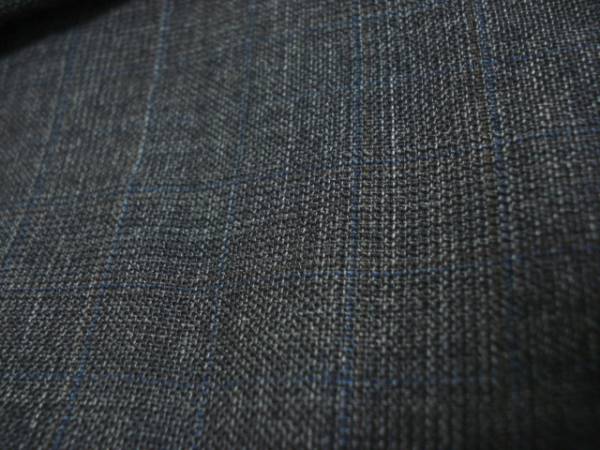 一見グレーの無地に見えますが、グレー地に薄いグレーの格子とラインの細いブルーの格子で薄いチェック柄になっています。上品でお洒落な薄チェックジャケットになります。