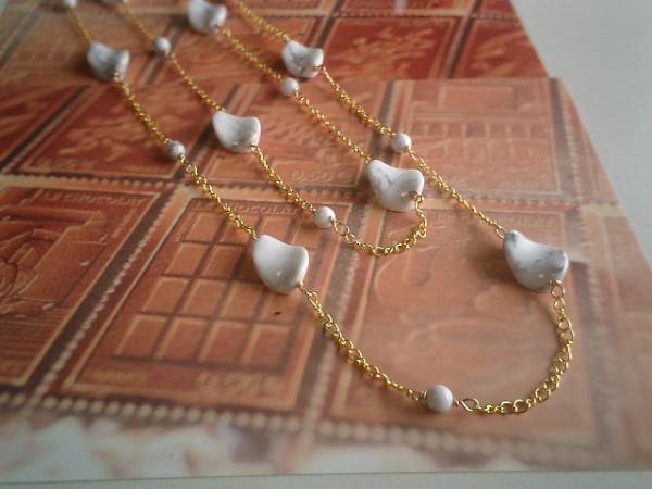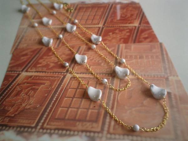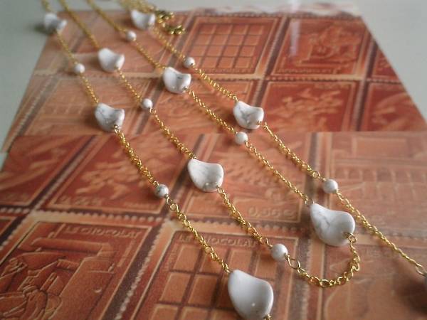 ジゼルの宝石箱・・シリーズです♪やさしい白・・白地にグレーの模様がアートな表情のハウライトのネックレス2点セットです♪同じデザインの長さ違いです♪重ねてネックレスに1本をブレスレットにと色々に楽しんでいただけます♪ハウライトは16×12ミリのツイストオーバル、6ミリの丸玉です♪長さは長い方が115センチ位で調節自由です♪2連にされても素敵です♪短い方が74センチ位で調節自由です♪ブレスレットにされても素敵です♪それぞれ単品やブレスレットも出品しています♪♪シンプルで飽きのこないいつまでも着けられるデザインを考えて作りました!ハンドメイドをご理解頂いてノークレーム、ノーリターンでお願いします