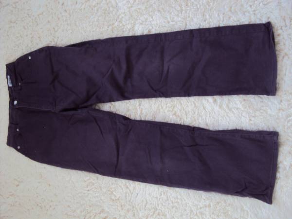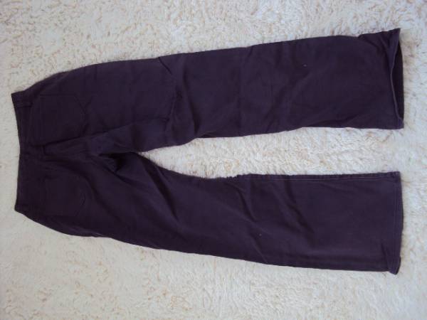 東京のお店で購入した、シックな紫色のカラーパンツになります。サイズの方は、ウエスト68cmです。2年程、着用しましたので、膝の箇所に糸が出ている箇所が1箇所ございました。着用して頂くには何も問題はないかと思われますが、ご理解頂ける方に限らせて頂きたいと思います。ブーツカットになっておりますので、足のラインが細く見えて、とても着用しやすい商品です。全体的に落ち着いたデザインになりますので、トップスにも合わせやすいです。当方、ただいま引っ越しの準備に伴う、荷物の整理を行っております。どうぞ宜しくお願い致します^^*