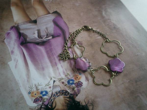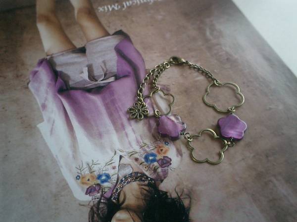 ジゼルの宝石箱・・シリーズです♪フラワー・フラワー・・キュートなフラワーシェルやフラワーチャームのブレスレットです♪ダークパープルのお花のシェルにお花のリングチャームを合わせて大人のロマンチックしています♪お花のシェルは15ミリ位です♪長さは全長23センチ位で調節自由です♪♪お揃いのネックレスやピアスも出品しています♪シンプルで飽きのこないいつまでも着けられるデザインを考えて作りました!ハンドメイドをご理解頂いてノークレーム、ノーリターンでお願いします