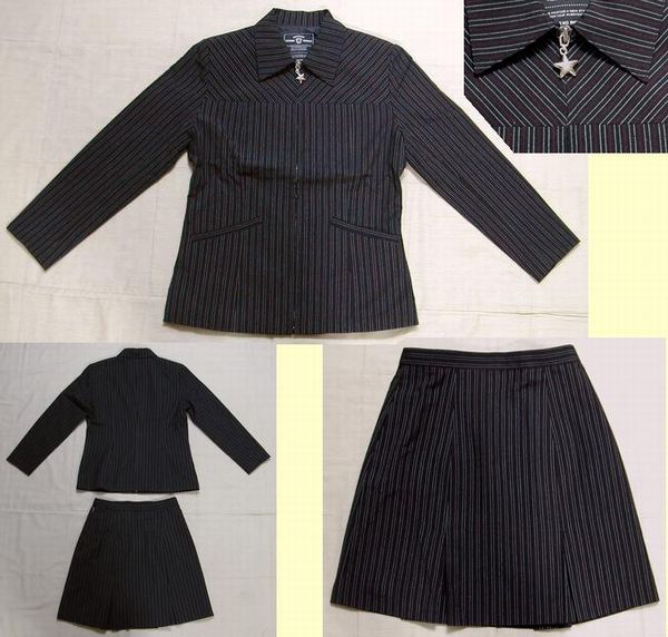 黒地に赤と白のピンストライプ柄素材のジャンパー&スカートのスーツです。