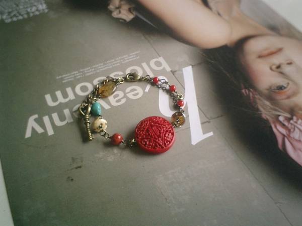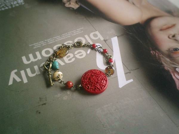ロゼッタの宝石箱・・シリーズです♪チャイニーズ気分・・シックなターコイズとスポンジ珊瑚のブレスレットです♪チェコビーズや堆朱ビーズを合わせてオリエンタルモダンしています♪スポンジ珊瑚は4ミリ、6ミリの丸玉、ターコイズは7ミリから9ミリ位のタンブルです♪トップの堆朱ビーズは22ミリ位です♪長さは全長23センチ位で調節自由です♪♪お揃いのネックレスも出品しています♪シンプルで飽きのこないいつまでも着けられるデザインを考えて作りました!ハンドメイドをご理解頂いてノークレーム、ノーリターンでお願いします