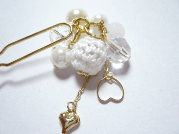 | 2個のハートのチャームと手編みのモチーフが可愛いです。 | ||