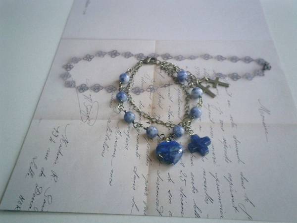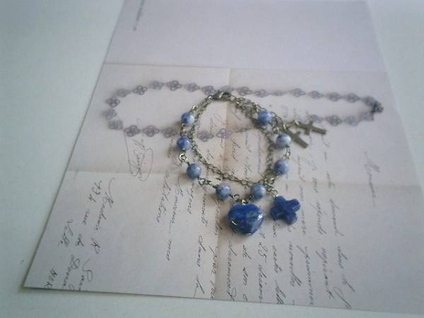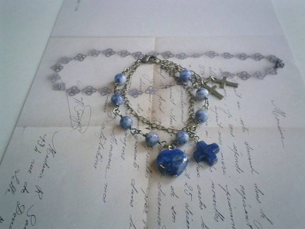 エゴイスト・少女・・シリーズです♪ブルーデニムの感性・・爽やかなデニムラピスの2連のブレスレットです♪ラピスのハートとクロスのトップがキュートな表情です♪デニムラピスは6ミリの丸玉です♪トップのラピスのハートは13ミリ、クロスは12ミリ位です♪長さは16センチ+アジャスター6センチで全長22センチ位です♪お揃いのネックレスも出品しています♪シンプルで飽きのこないいつまでも着けられるデザインを考えて作りました!ハンドメイドをご理解頂いてノークレーム、ノーリターンでお願いします