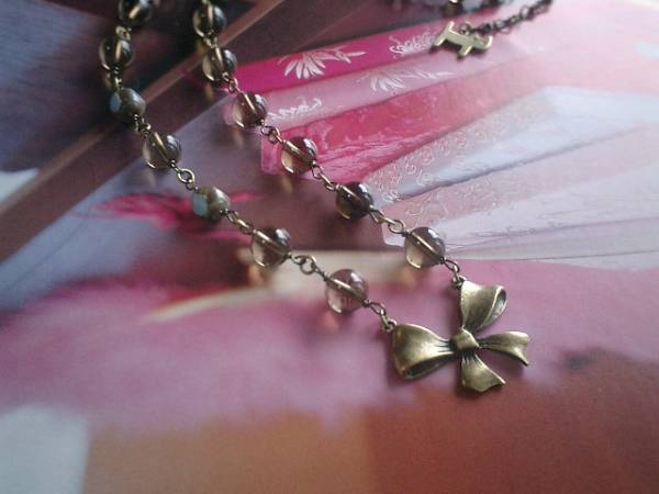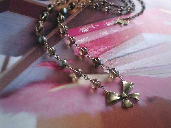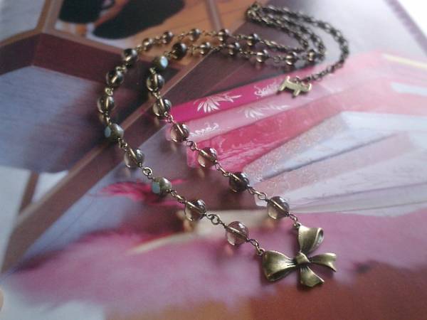 女の子テイスト・・シリーズです♪永遠のリボン・・繊細なスモーキークォーツのネックレスです♪リボンのチャームとチェコビーズを合わせて可憐な表情です♪スモーキークォーツは8ミリ、6ミリの丸玉、チェコビーズは8ミリ、リボンチャームは30×20ミリ位です♪長さは全長75センチ位で調節自由です♪お揃いのブレスレットも出品しています♪シンプルで長く着けていただけるデザインを考えて作りました♪ハンドメイドをご理解頂いてノークレーム、ノーリターンでお願いします