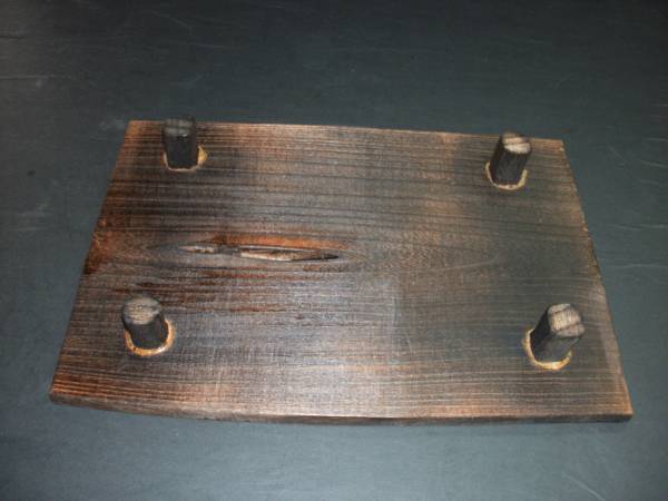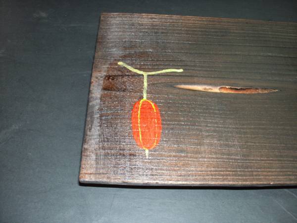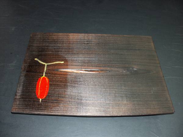 桐の一枚板を焼いて木目を浮き上がらせ、飾り台を作りました。材料の一枚板の自然の形を生かして飾り台を作っています。そしてその黒い焼桐を背景としてからす瓜の絵を描き飾り台のワンポイントとしました。 サイズ:32cmx23cmx4cm この度は思いきった値段にしました。 |
