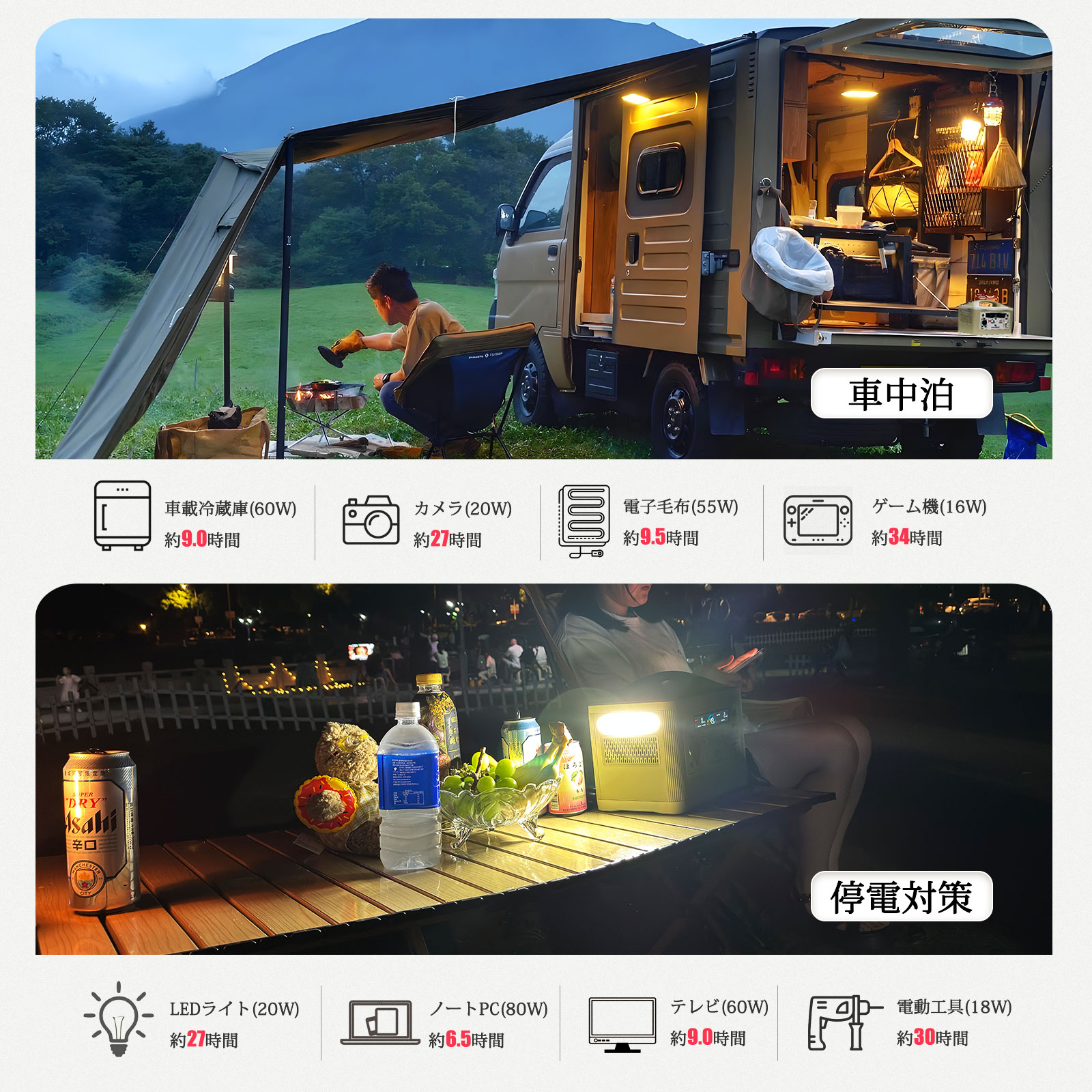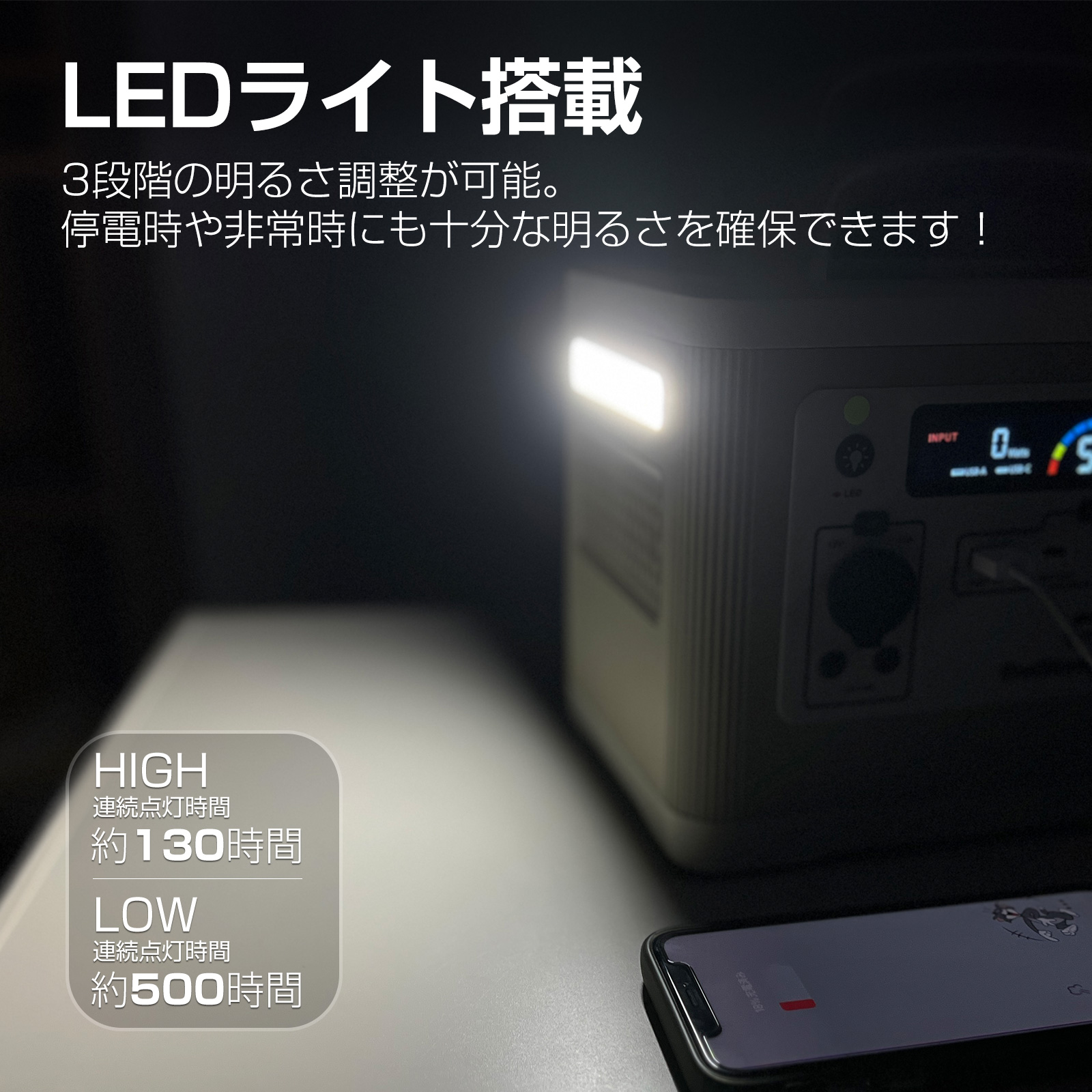 ★オススメポイント★ 安全性が高いリン酸鉄(LifePo4)バッテリー 安定性・安全性が高く、長寿命のリン酸鉄リチウムバッテリーを採用。 寿命は、従来のポータブル電源の約4倍以上(約2000回の充放電サイクル)! 出力は5WAY! AC/DC/シガーソケット/QC3.0/Type-C出力機能を搭載しました。 さまざまな家電製品・電子端末を快適に使用・充電する事が可能です。 大容量・大出力 大容量の537.6Wh!定格出力700wで日常家電から作業用途までに対応可能です。 キャンプ・車中泊・災害時などに幅広く活躍します。 LCDディスプレイ バッテリー残量や消費電力・使用時間などが一目でわかるLCDディスプレイを搭載。 初心者・不慣れな方にも安心です 周波数切り替え式! 電気に詳しい方ならきっと気になる、周波数切り替えの可否! 家電製品の多くは、50HZ/60HZ兼用のヘルツフリーが多く流通していますが、一部の製品では、兼用できても性能が異なることや 異なる周波数では使えない!といった商品も存在します。 本製品なら、日本東西のどちらで流通している製品でも周波数を切り替えるだけで快適にご使用いただけます。 主な利用シーン ・災害時・避難時・停電時などの防災用品として ・大容量・正弦派出力のためあらゆる電気製品にご利用いただけます ・電動工具・大型照明・工具充電用など工事・作業現場でも活躍 ・誘導灯・大型照明・電飾看板・電飾など屋外イベントなどに ・キャンプ・釣り・レジャー・グランピングなどアウトドアに ・電気毛布・電子ケトル・電子レンジ・小型冷蔵庫など車中泊に ※本製品は、医療機器への使用を想定して製造されている物ではございません。 医療機器へのご利用はお控え下さい。ご利用により生じた損害について、一切の責任を負いかねますので予めご了承下さい。 |