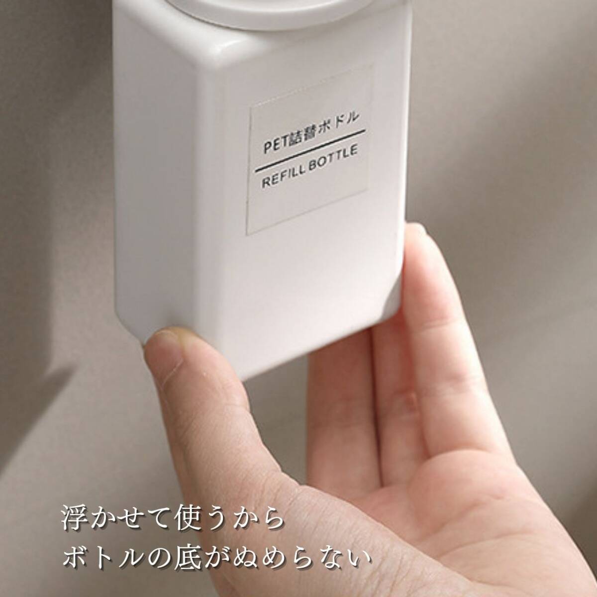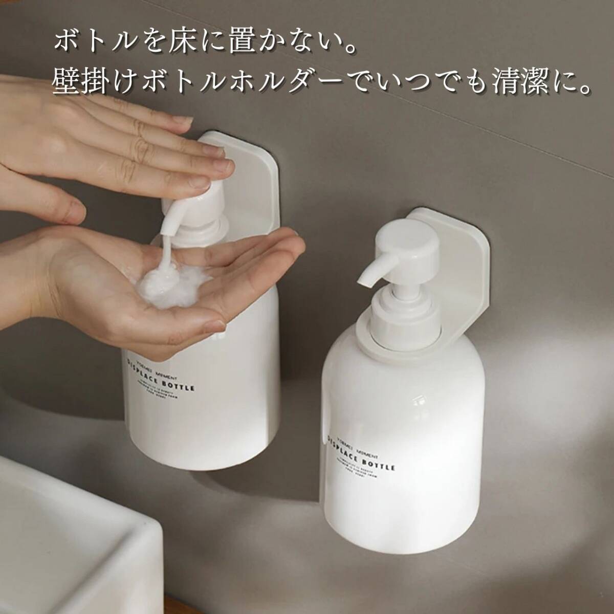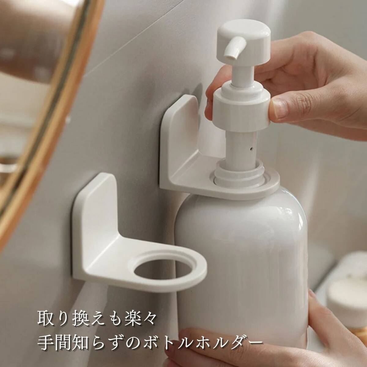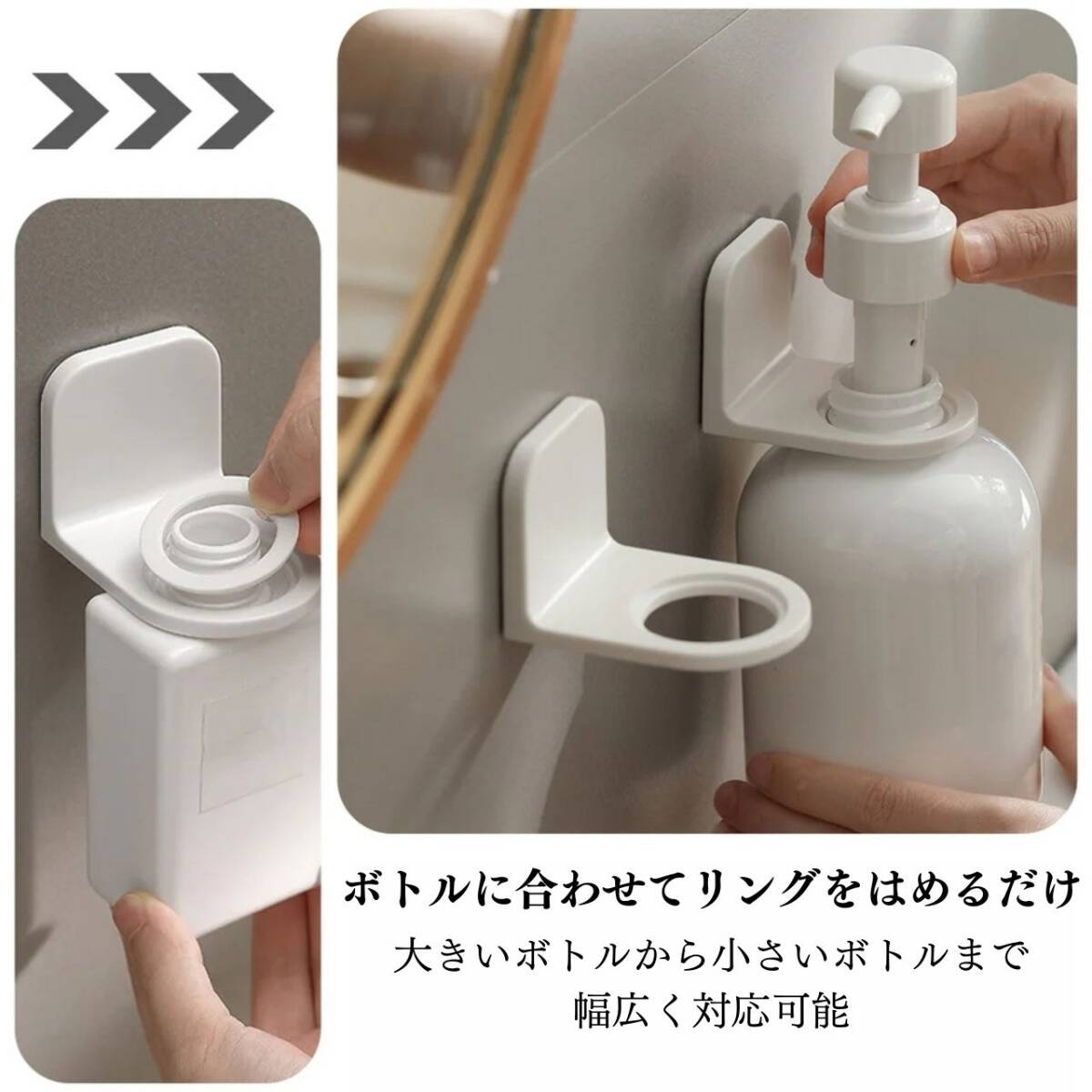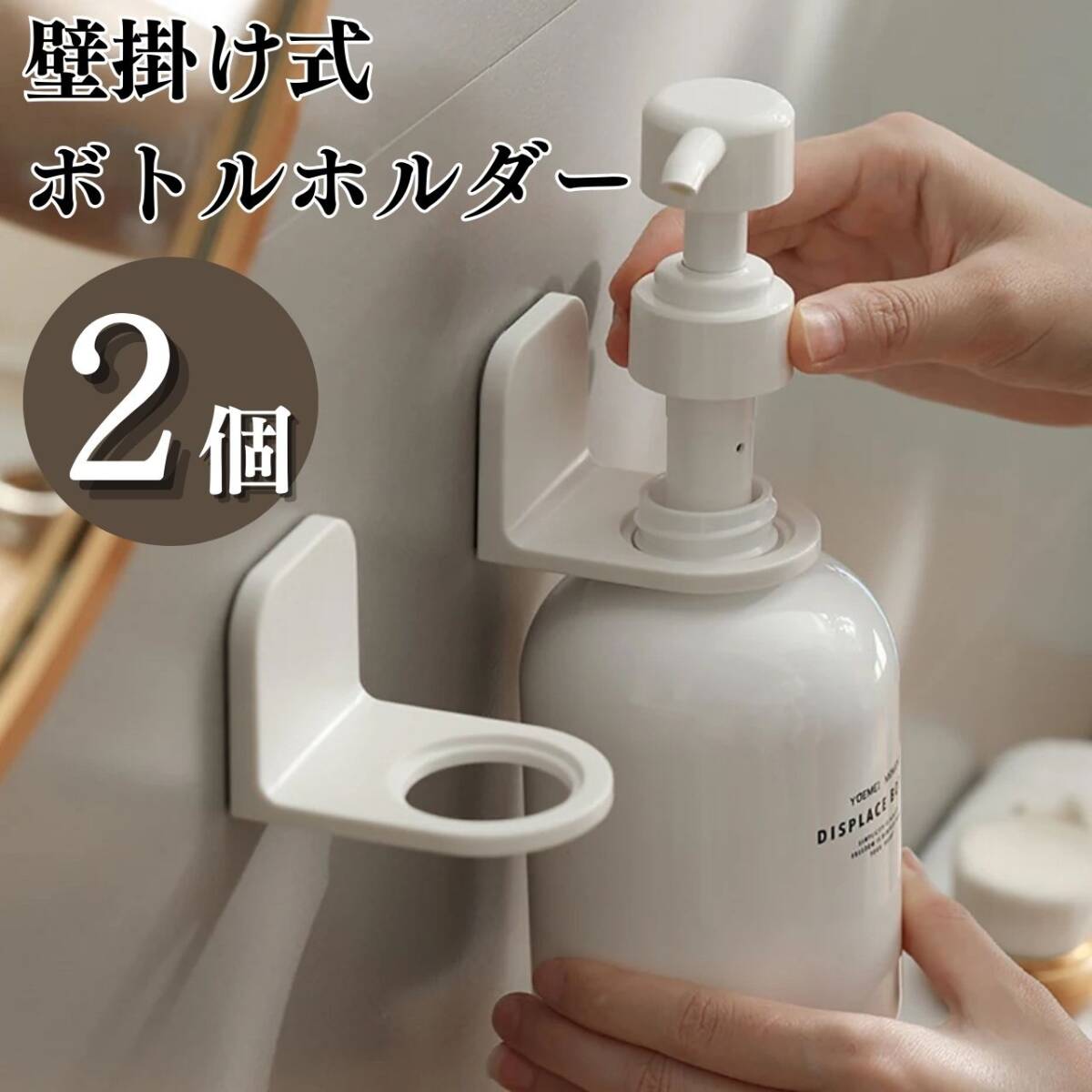 【お得なセット販売】貼るボトルホルダー 2個セット【セット内容】貼るボトルホルダー シール式壁掛けフック調整リング大/小各2個ずつ※ボトルは付属しません。【商品詳細】耐荷重 約1kg付属品 サイズ調整リング 27mm / 24mm【使用上の注意 】※当製品は表面がツルツルとしたフラットな面にしか固定できません。凹凸がある面、エンボス加工が施されている面、柔らかい面、曲面等には固定できませんのであらかじめご了承ください。※タイル面にはご利用いただけません。※壁面に水分が付着していると、しっかりと貼りつかず使用中に脱落する恐れがあります。必ず接着面が乾いた状態で貼ってご使用ください。※小さいタイル壁など、シートのサイズよりも貼り付け面が小さい箇所では、耐久性が落ちるためご使用にならない様にお願い致します。※水洗いした粘着シートをタオルなどで拭くと、繊維や埃などが付着してしまい、使用中の脱落原因になります。自然乾燥させるなどしてご使用ください。※カラーボックスにはご利用いただけません。【注意事項】・海外製品のため多少の傷や汚れ等ある場合がございます。・送料の都合上箱なし、簡易包装での発送となります。コメントなしでの即購入OKです。おまとめ買いでお値引きさせていただきます。お気軽にコメントください。 貼ってはがせる シャンプーボトル 壁掛け ホルダー シンプル 透明 リンス トリートメントボディソープ シャンプーホルダー マジックフックシート おしゃれ 風呂 バスルーム 浮かせる 収納整理 整頓 清潔 送料無料