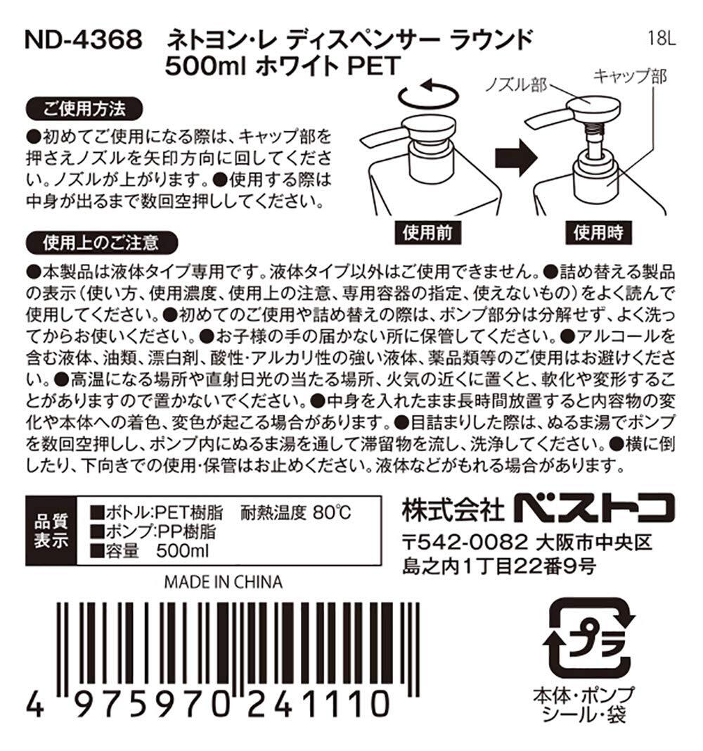 ベストコ(Bestco) シャンプー用ディスペンサー ホワイト 500ml ネトヨン・レ ラウンド ボトル ND-4368