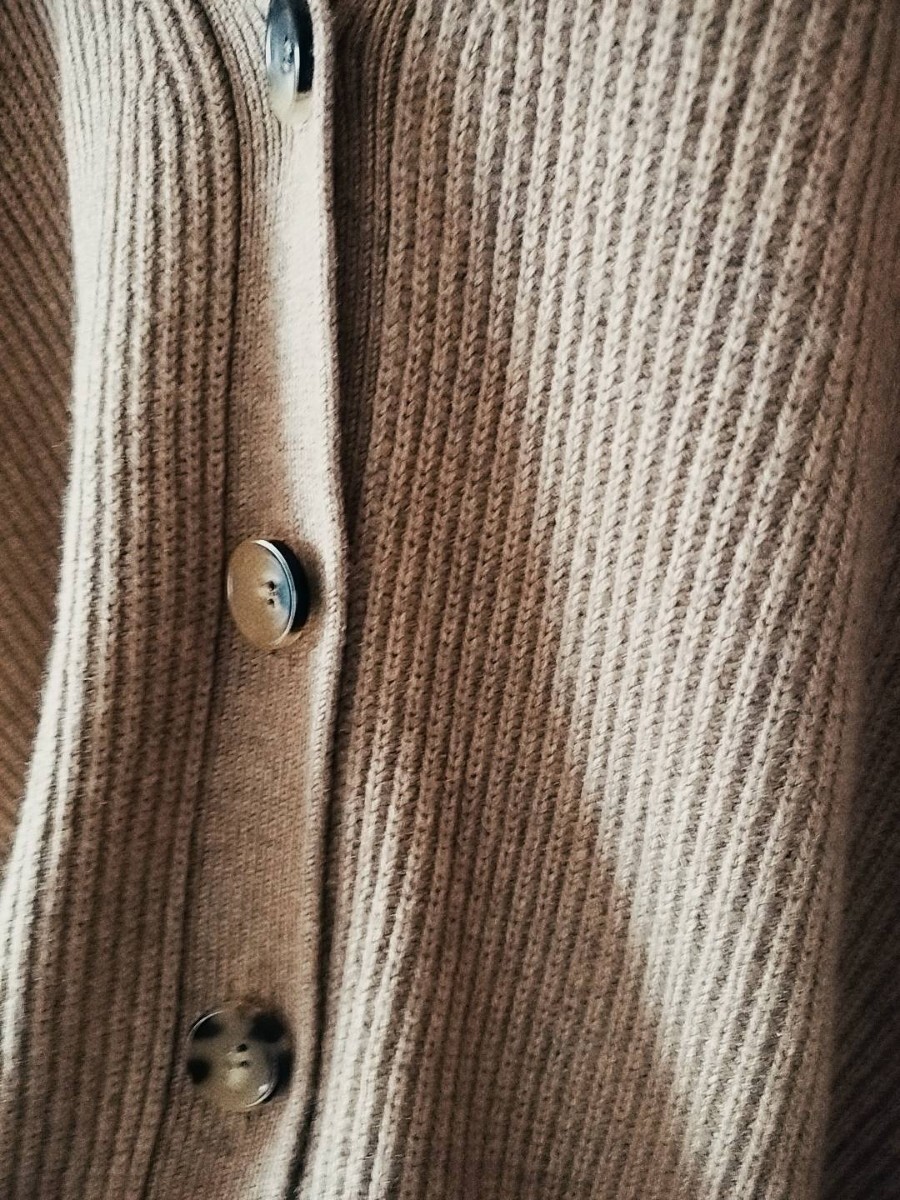 ミルクティーのような優しい色味がとても素敵です。1~2度程度の着用かと記憶しております。脇下など擦れる所はやや毛羽立ちございますが個人的には目立つものでは無いかと思います。