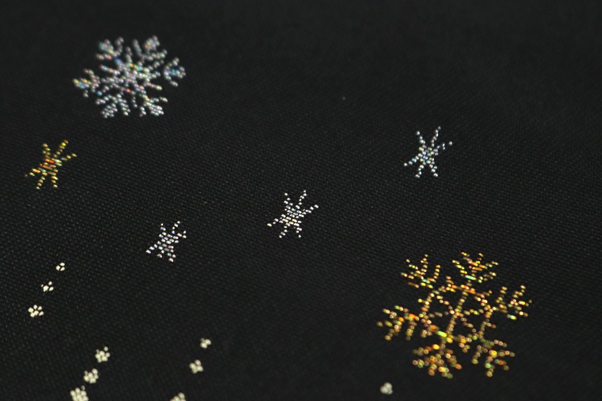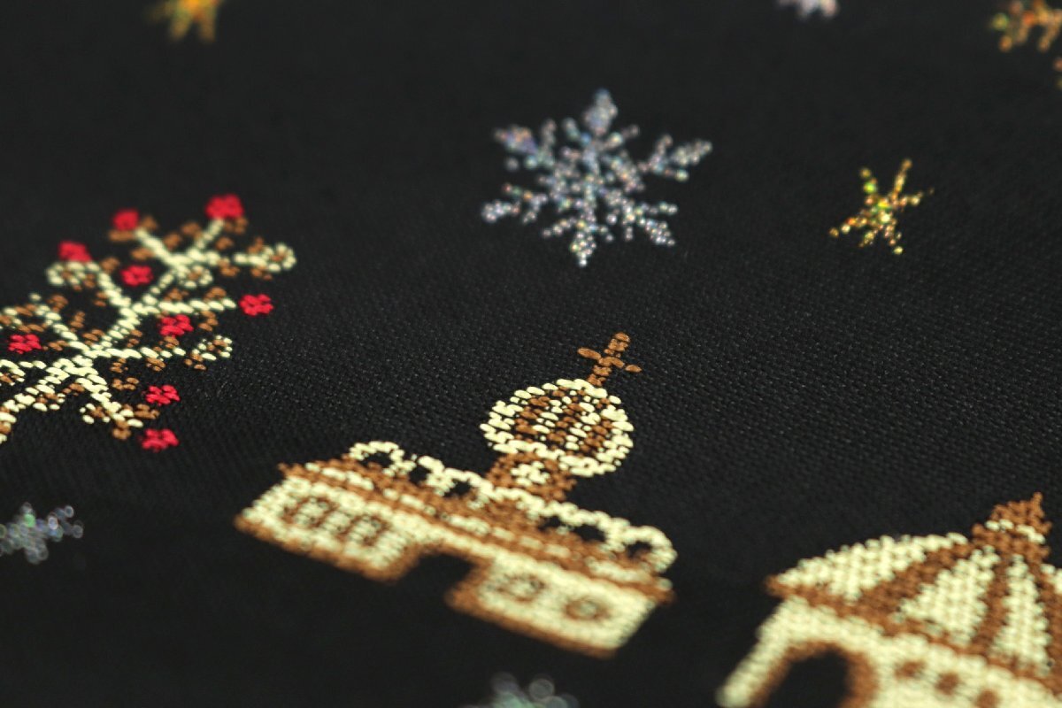 白色や緑色、赤色、茶色、生成り色のお色目の糸で、サンタクロースや雪だるま、天使、トナカイ、オーナメント、雪の結晶、教会などがボーダー状に織り上げられております。