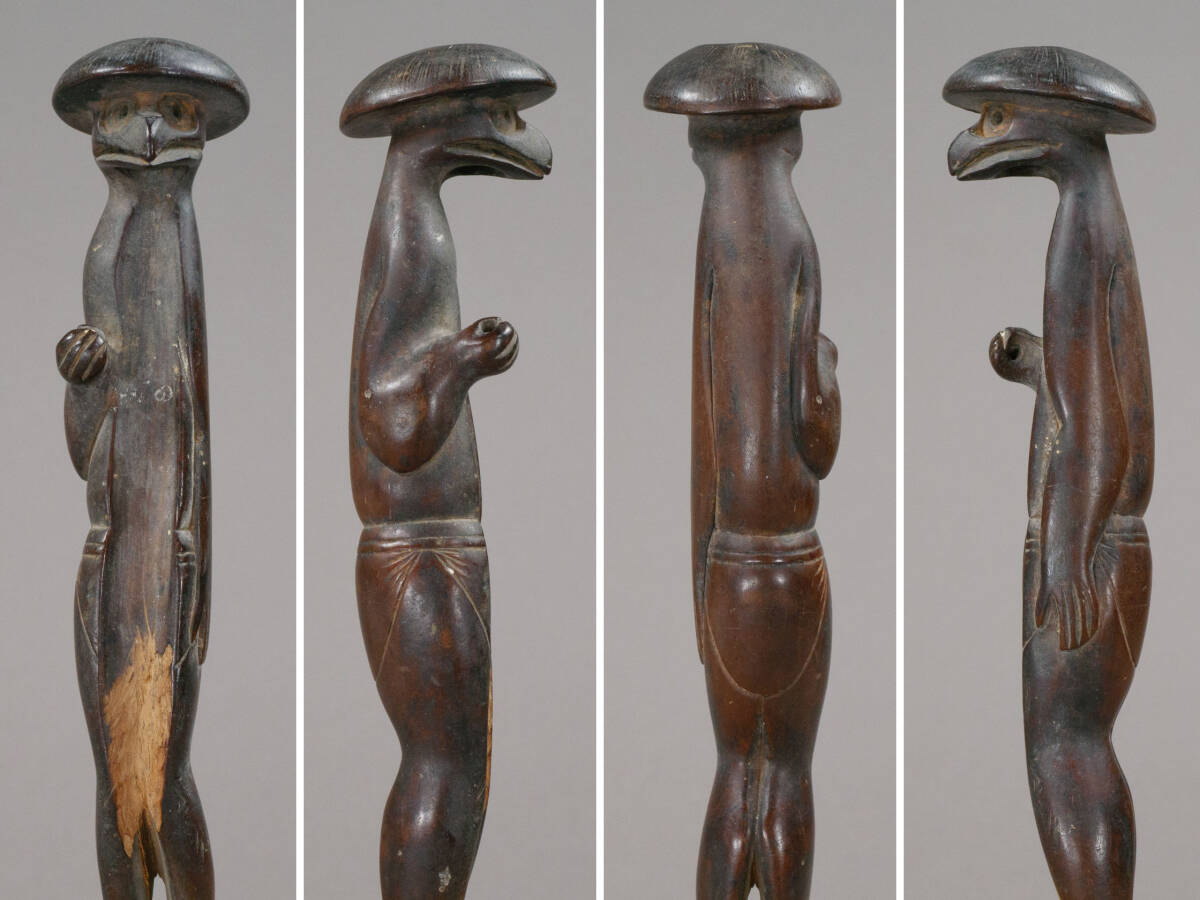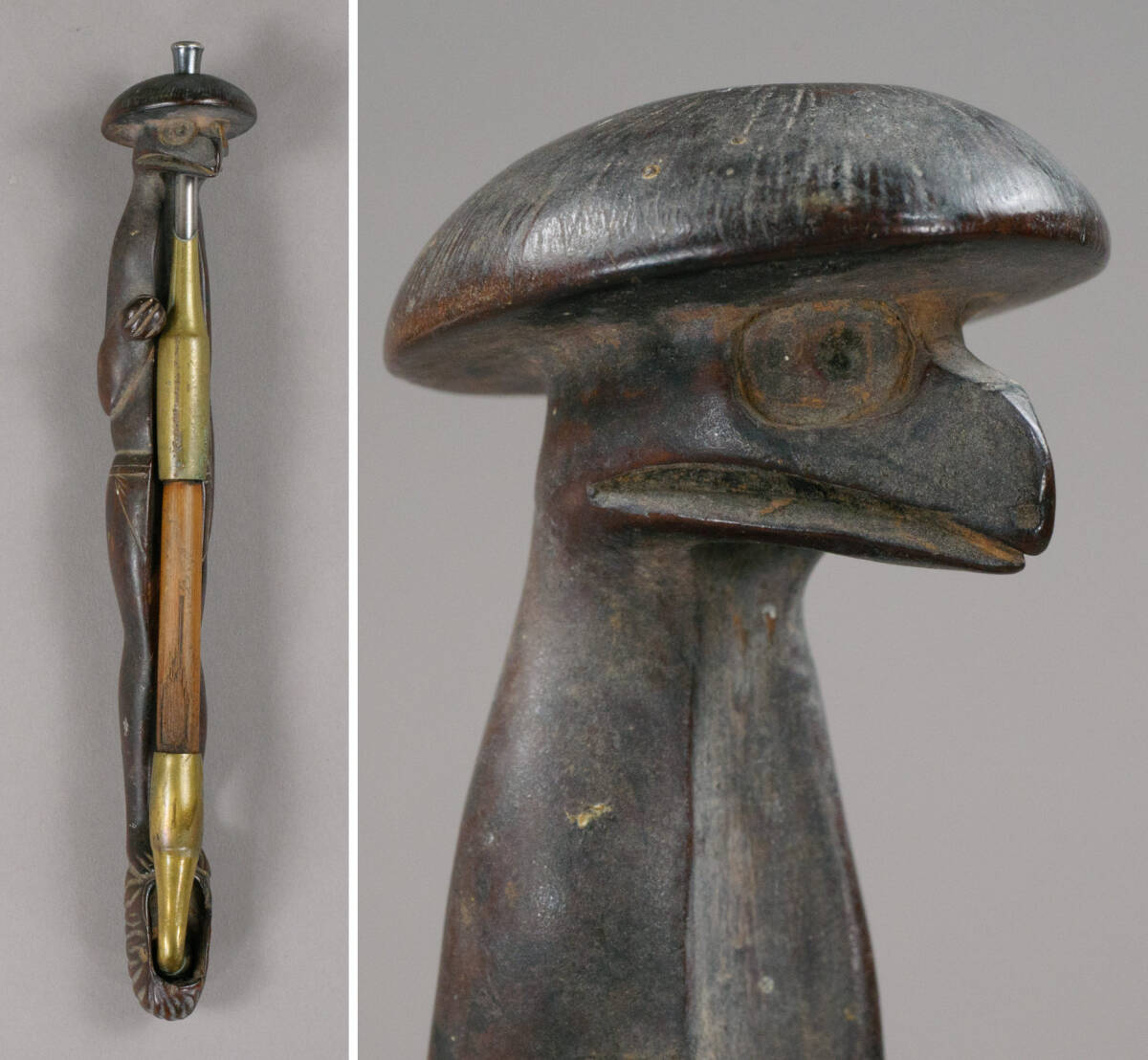 | <商品説明> 長さ206mm 重さ50g とても珍しい古い河童の木製煙管入れです。 右手が紐通し穴になっています。 煙管のサイズに合わせるために残念ながら腿あたりが削られています。 手持ちにちょうどいい煙管があったのでお付けしますが、状態の悪い煙管なのでおまけ程度にお考えください。 このオークションページには載せきれない詳しい大きい画像を別ページにたくさんアップしていますので以下のURLからご覧ください。 https://photodepot.daa.jp/kiseru/kiseru.html |
