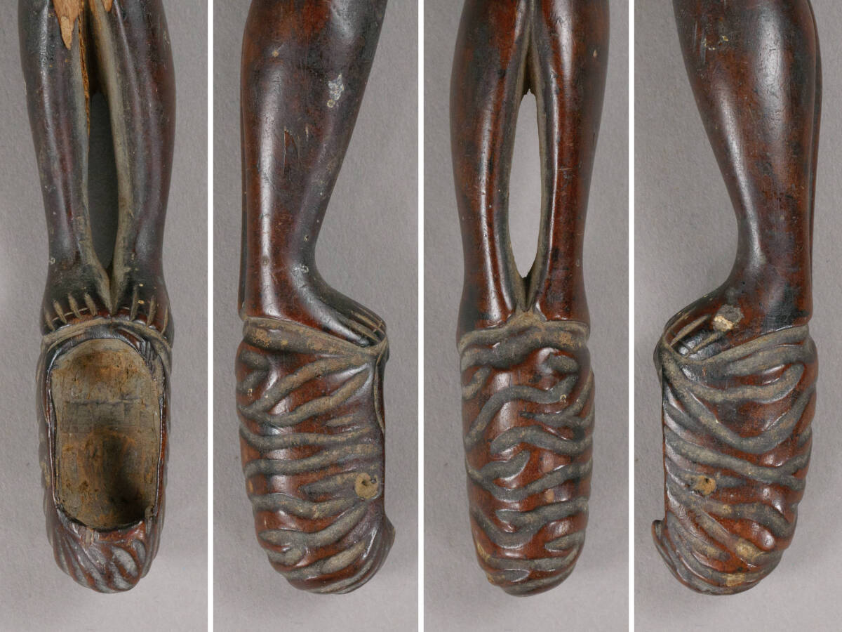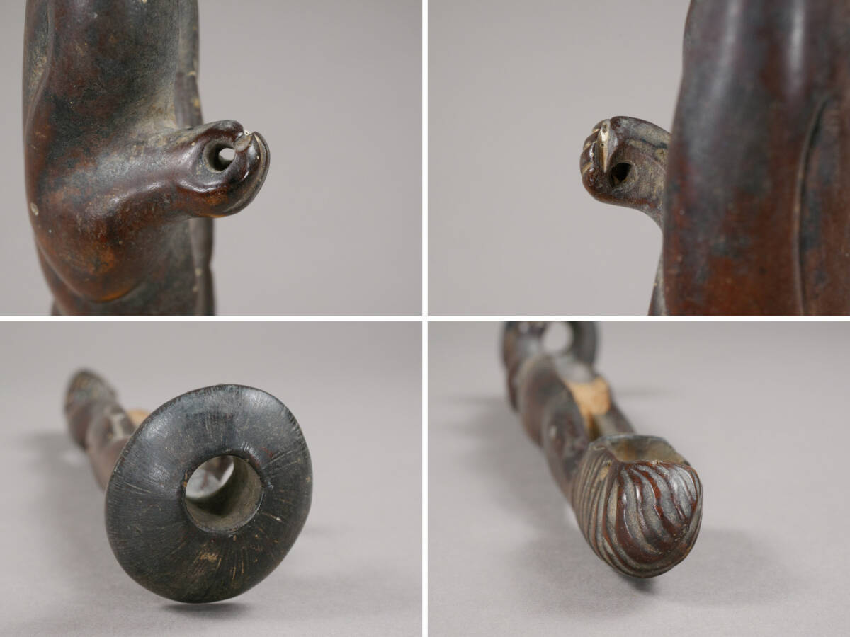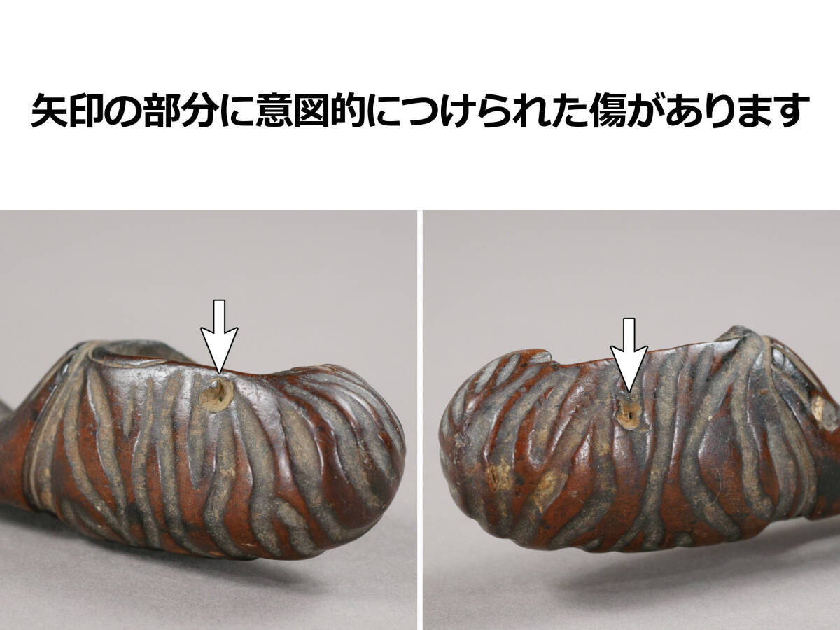 | <状態> ・煙管のサイズに合わせるために腿あたりが削られています。 ・目的は分かりませんが意図的につけられたピンホールのような小傷が2箇所あります。 ・古い品なので経年の傷み、汚れ等があります。 |