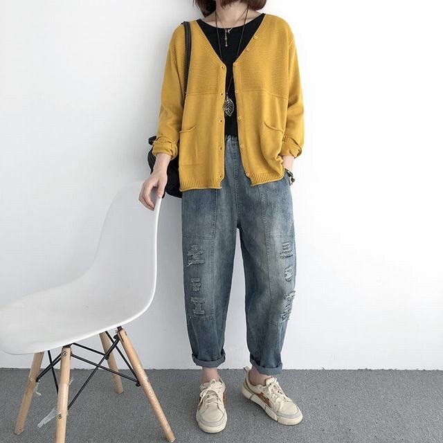 春 秋ニットセーター 秋 アウター カーディガン レディース 羽織 ショート丈 無地 長袖 ゆったりイェロー