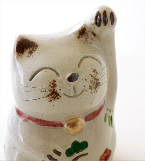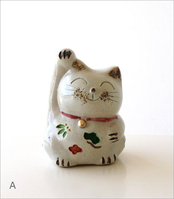 | こちらのページでは【Aタイプ】のみの販売です 江戸の昔より お金や人を招き入れてくれる縁起物として 親しまれてきた招き猫 つるんとした器肌に 目、髭、松竹梅の模様など、 職人さんがひとつずつ手彫りでデザインし 色鮮やかな色付けでおめかしをしています にっこり微笑みながら 手をこまねいている可愛い姿と表情は 見る人にほっこりした気持ちを運んでくれます 商品名 : 招き猫 松竹梅 商品番号 : mkn4230 全体のサイズ(cm) : 右手)幅10×奥行9.5×高さ15 左手)幅9.5×奥行9×高さ13 材質 : 陶器 重量 : 右手)560g 左手)570g 生産国 : 日本(瀬戸) ※手作り品の為、個体差のある商品です ※陶器の裏面は多少ざらざらとしているため、テーブル等の擦り傷にご注意ください -陶器(土物)の特性とお願い- 土物は同じ技法、同じ窯で焼成しても土や釉薬に含まれる天然鉱物などの影響や天候で焼き上がりは微妙に異なります。工業製品のように同一の物になる事はありません。手作りの不均一性、窯変、釉薬の細かいヒビ(貫入)や垂れ等は、製造元より土物の特性として良品の扱いとなります。ご理解頂きお買い求めくださいますようお願い申し上げます |