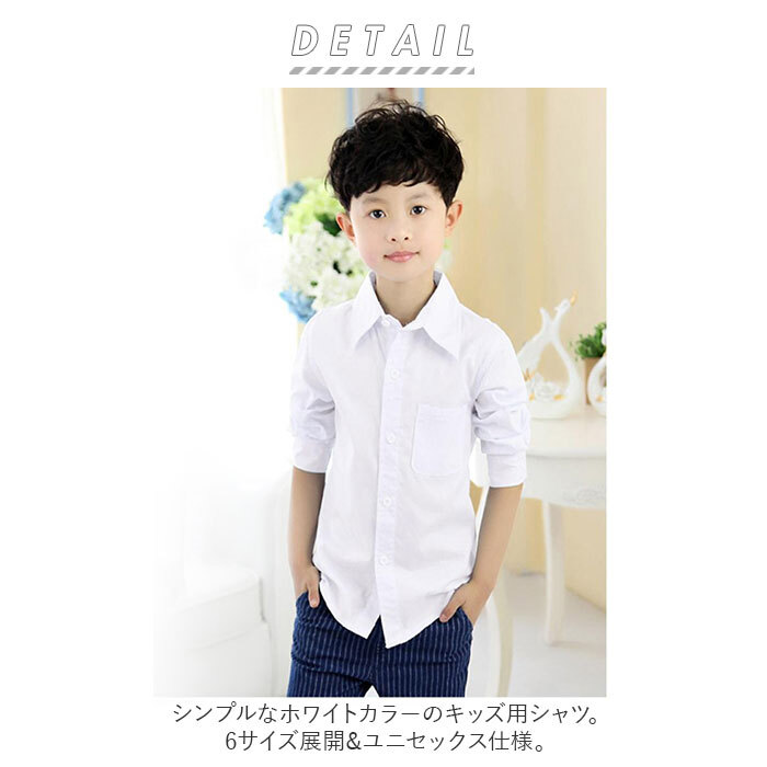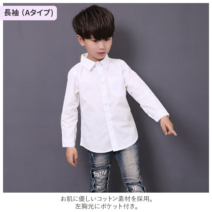 | 商品説明 | ・・シンプルなホワイトカラーのキッズ用シャツ。 ・お肌に優しいコットン素材を採用。 ・左胸元にポケット付き。 ・6サイズ展開&ユニセックス仕様。 ・長袖(Aタイプ)と半袖(Bタイプ)の2種類をご用意。2種類揃えれば、季節によって使い分けもOK。 ・フォーマルシャツとして大活躍。 |