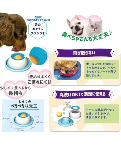 単品-/-/4974926012187・Style:単品・パッケージ個数:1・転がるボールについた分だけ舐めれる、おいしくて楽しい時間が長く続く液体フード用食器。分解、丸洗いOK、すべり止め付き、日本製。・液体のペットフードやペットの牛乳をゆっくりぺろぺろできる。・わんちゃんの舐め方を研究し、回りを舌のお掃除ブラシに凸凹を舐めて舌の汚れをこすり落とす。・わんこの味覚玉専用フード「わんこの健康ピューレおなかケア」(別売り)・わんこの味覚玉専用フード「わんこの健康ピューレ口周ケア」(別売り)