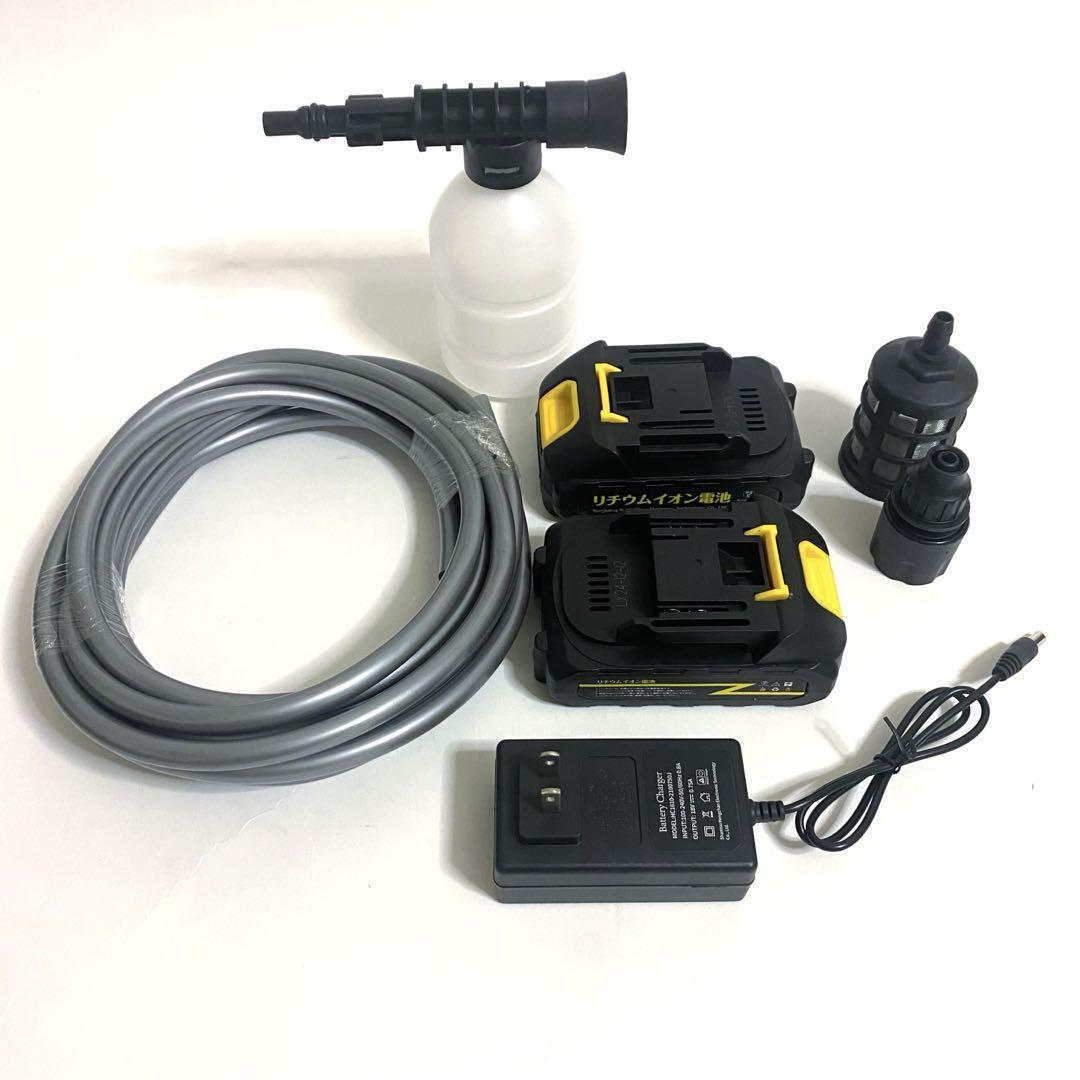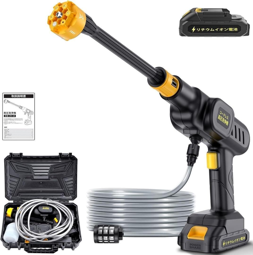 パッケージ内容:高圧洗浄機本体、2個バッテリーパック 、充電器 、6 in 1 ノズル、フォームノズル、ホースカップリング 、5m 給水ホース、ストレーナー 、収納ケース 、日本語取扱説明書。