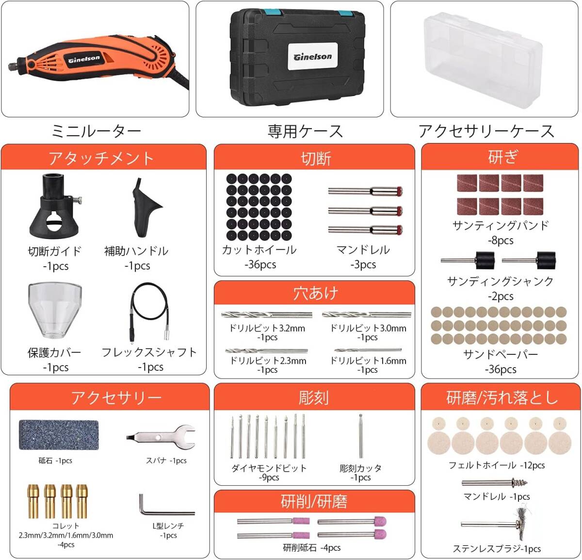 セット内容は本体、専用収納ケース、アクセサリーケース、4つのアタッチメント(ディテーラーズグリップ、カッティングガイド、フレックスシャフト、保護カバー)、150個のアクセサリー、日本語の取扱説明書が含まれています。