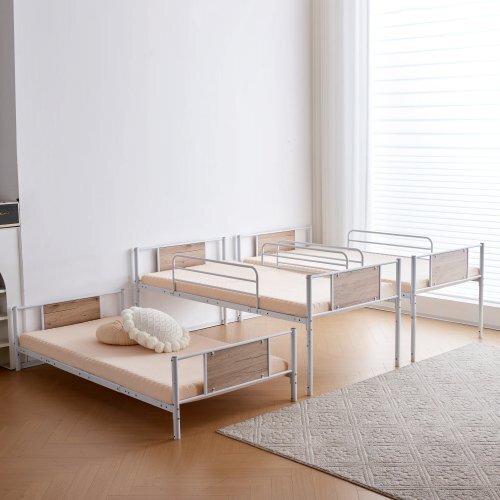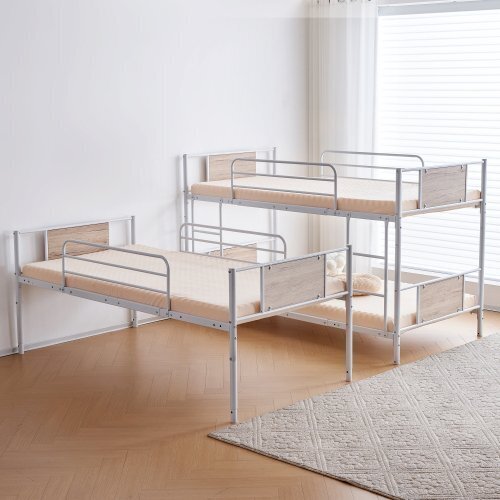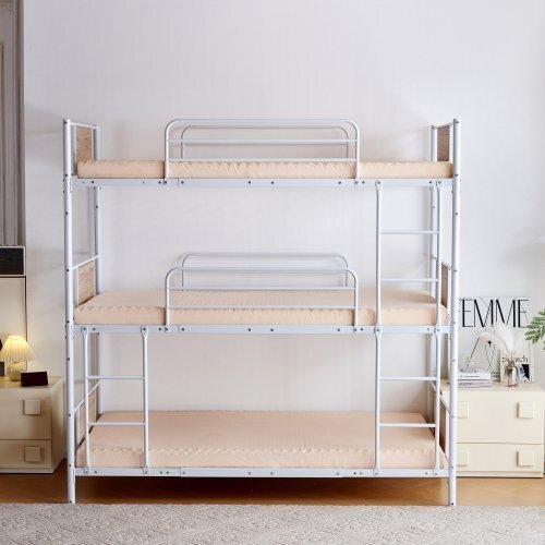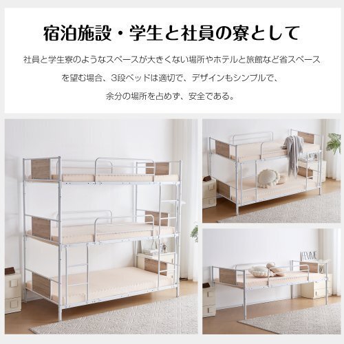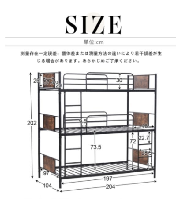 商品説明 1.分離可能三段ベッド 各ベッド分割可能2.しっかり支える耐荷重120 kg3.シンプルなデザイン4.省スペースの設計5.サイドフレーム付く6.通気性抜群のフレーム床サイズ 外寸:104幅×204長さ×202高さcm 重量:56kg 各段耐荷重:約120kg 素材:MDF+スチール(塗装仕上