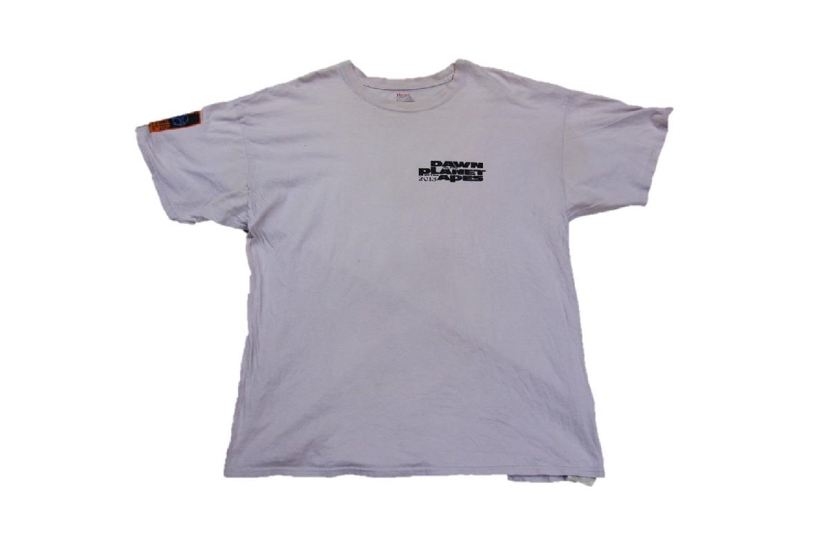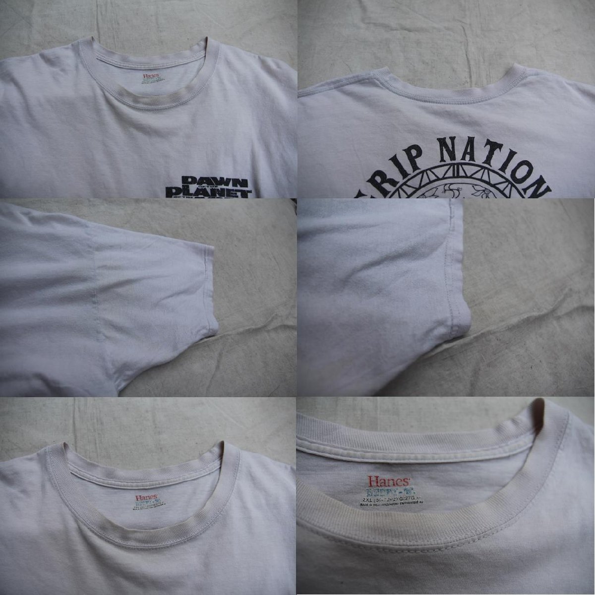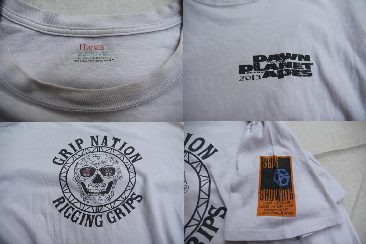 2010年以降のヘインズ製プリントTシャツとなります。フロント左胸、バック、右袖にプリントが入る豪華プリントでフロントには2013年表記とDawn Planet Apesの表記が入る事から映画「猿の惑星」の西海岸を中心とした都市で開催されたイベントグッズ等の際に作られたTシャツでしょうか。バックにはデザイン性が高いスカルに右袖には都市名等がプリントされております。カラーはグレーでサイズは2XLとビッグシルエットサイズとなります。実際猿の惑星シリーズで作られた物かは不明ですが大変格好良いプリントですので是非ご検討下さい。