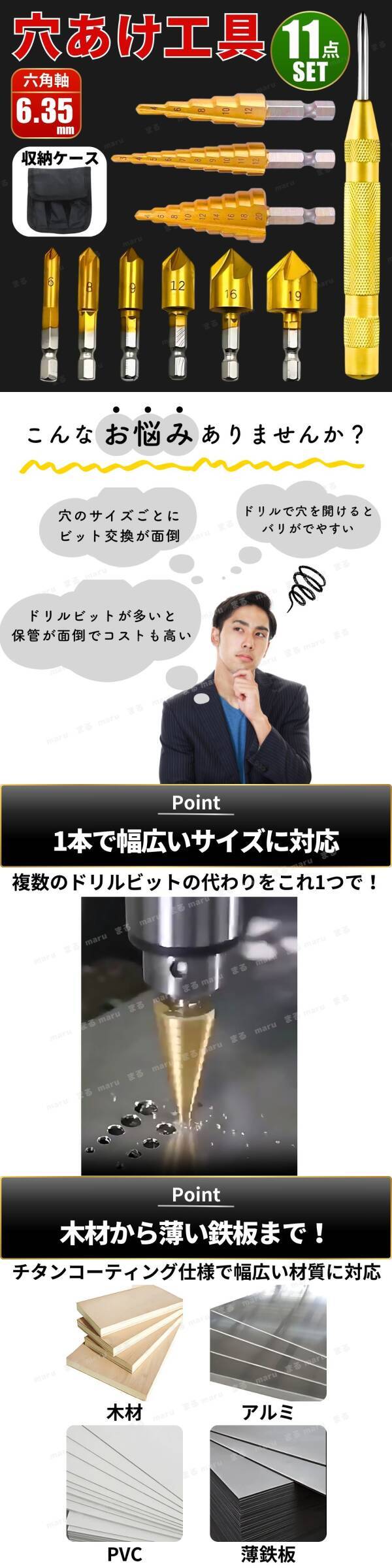 DIYやプロの作業に最適な穴あけ&加工ツールセットです。ステップドリル、ステップドリル専用ケース、面取りカッター、センターポンチを含む全11点が一つにまとまっています。このセットがあれば、金属、木材、プラスチックなどのさまざまな素材に対応可能です。